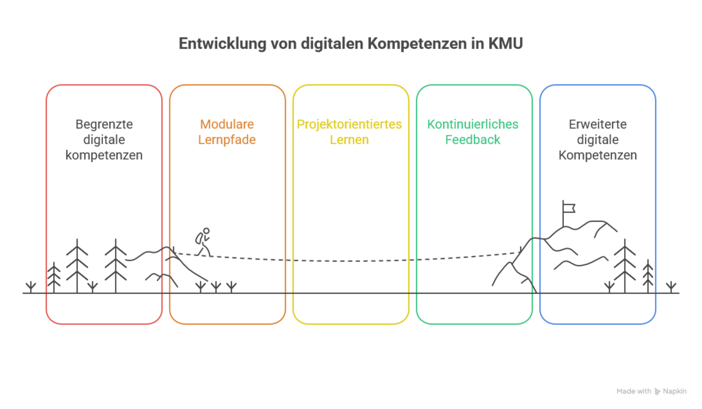 Der Aufbau digitaler Kompetenzen in produzierenden KMU ist ein komplexer, mehrdimensionaler Prozess, der gezielte didaktische Konzepte, strategische Verankerung und kulturelle Transformation erfordert. Das Vier-Klassen-Modell ermöglicht eine differenzierte Betrachtung der Kompetenzbedarfe und verdeutlicht, dass jede Kompetenzklasse unterschiedliche Lernformen und organisatorische Voraussetzungen benötigt. André et al. (2024) beschreiben in diesem Zusammenhang einen sechsphasigen Kompetenzmanagement-Prozess, der von der Rollen- und Aufgabenklärung über die Ableitung von Kompetenzprofilen bis zur Definition geeigneter Weiterbildungs-maßnahmen reicht. Ein nachhaltiger Kompetenzaufbau entsteht dann, wenn KMU Lernen als integralen Bestandteil von Arbeit verstehen und Strukturen schaffen, die individuelles, teamorientiertes und organisationales Lernen gleichermaßen ermöglichen.