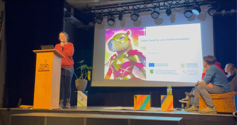Wissenschaftler:innen aus verschiedenen Instituten und Einrichtungen aus Görlitz stellten in 10-minütigen Vorträgen ihre Forschungsthemen vor. Das Publikum wurde so gut unterhalten und bekam unter anderem Einblicke in die wissenschaftliche Arbeit zu Zellulose-Schäumen, der Insekten-Interaktion von Schimpansen und das Görlitzer Probewohnen. Bernadette Rohlf, wissenschaftliche Mitarbeiterin am TRAWOS in der ESF-Nachwuchsforschungsgruppe "Frauenförderung durch individuelle und organisationale Kompetenzen in Bildung und Beruf (MINT)" präsentierte ihre aktuelle Projektarbeit und eine Auswahl von Capybaras.