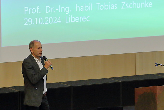 Doc. Inf. Jan Šembera, Ph.D. von der TU Liberec eröffnete den 20. Kreislaufwirtschafts- und Deponieworkshop und freute sich sehr darüber, deutsche und tschechische Gäste zum Jubiläum der Konferenz in der Aula der TU Liberec begrüßen zu dürfen.