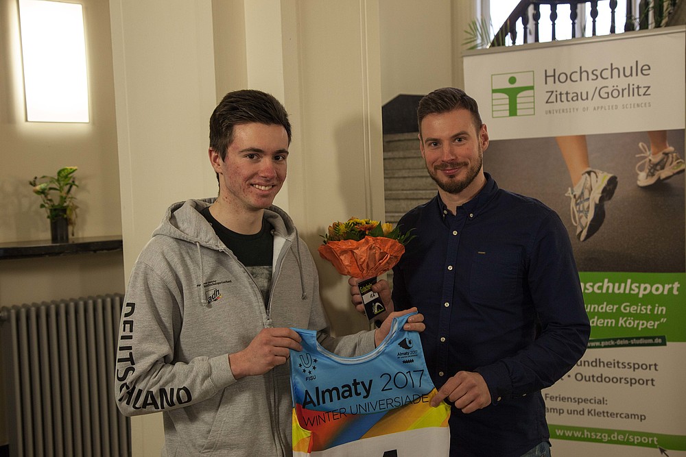 Tom Krause ist zurück von der Universiade, bei der er für die Hochschule Zittau/Görlitz in der Nordischen Kombination angetreten war. Philipp Knebel, Leiter des Hochschulsports der HSZG hat ihn gebührend empfangen und zu einem kurzen Interview eingeladen. Hier schildert Tom seine Eindrücke von der zweitgrößten Sportveranstaltung der Welt nach der Olympiade! Das Interview befindet sich auf unserer Facebookseite unter: https://www.facebook.com/HochschulsportZIGR/. Viel Spaß beim Anschauen!
