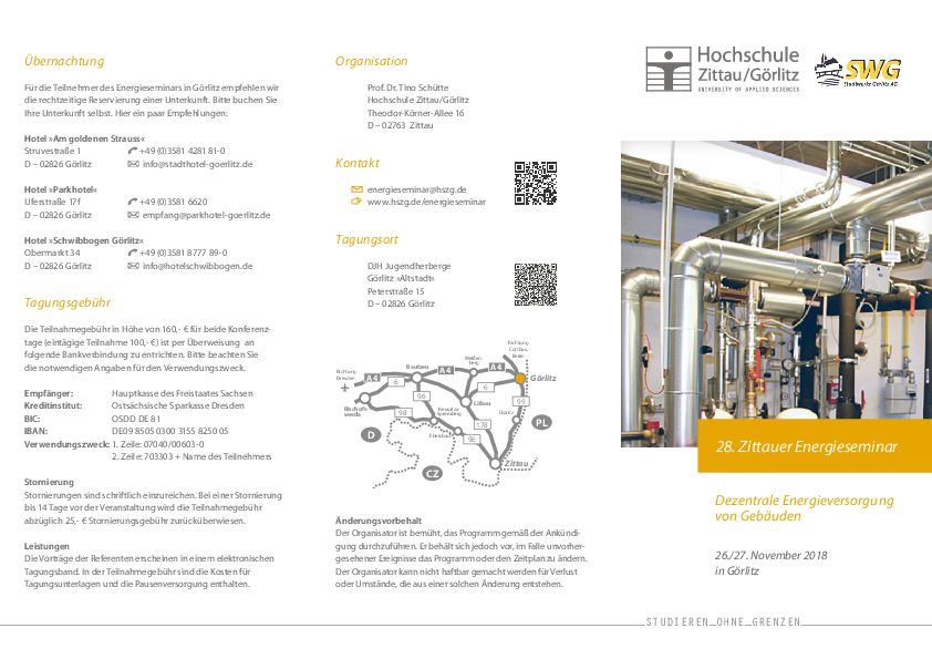 Am 26. und 27. November 2018 findet das 28. Zittauer Energieseminar der Hochschule Zittau/Görlitz statt. Tagungsort ist in diesem Jahr die DJH Jugendherberge Görlitz "Altstadt", Peterstraße 15 in 02826 Görlitz. Das Energieseminar wird gemeinsam mit der Stadtwerke Görlitz AG ausgerichtet und steht unter dem Leitthema: