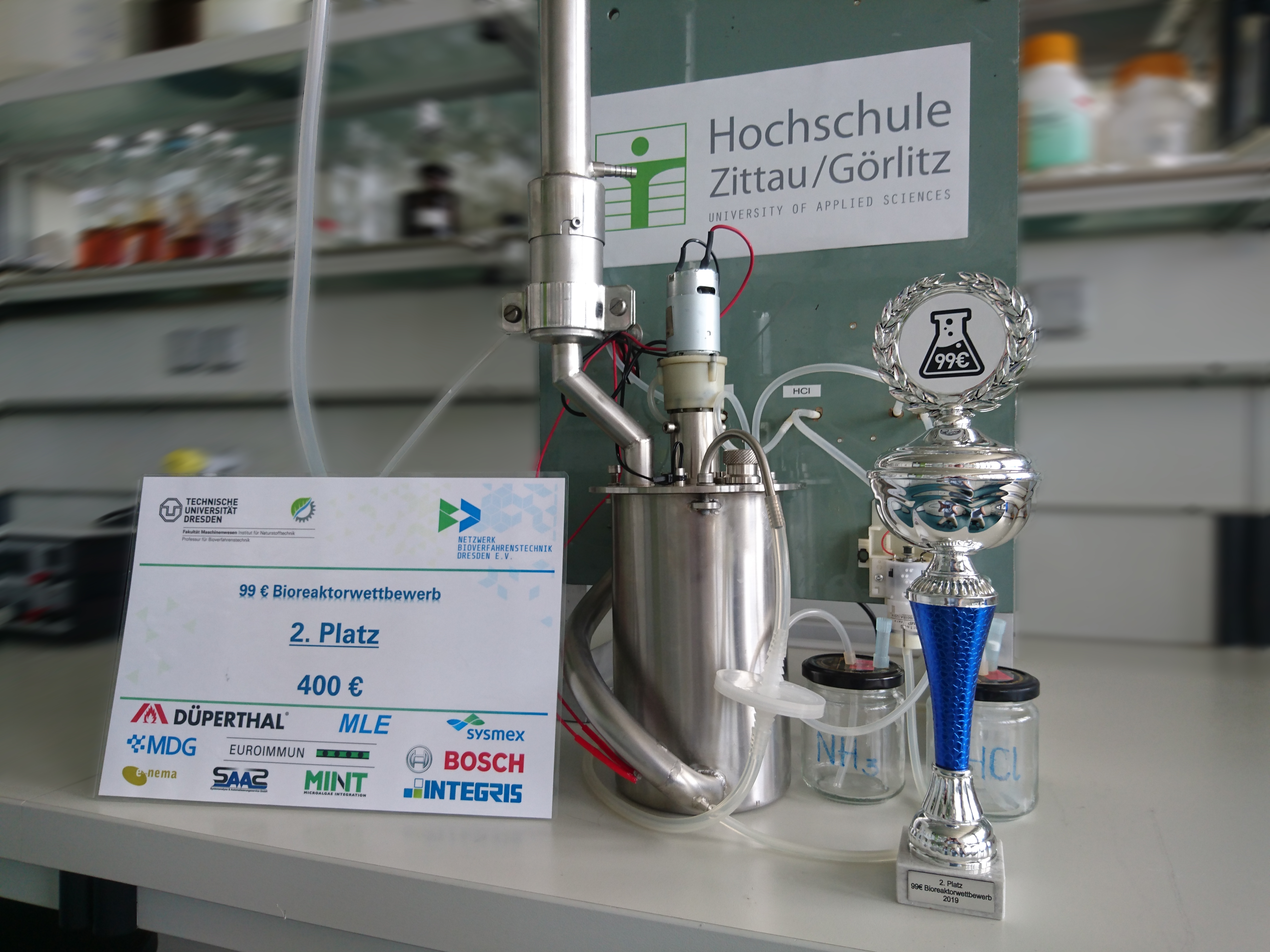 Das Motto "Schnell, schneller, Vibrio natriegens" bildete den Rahmen des diesjährigen 99€-Bioreaktor-Wettbewerbs an der TU Dresden, veranstaltet durch das „NETZWERK BIOVERFAHRENSTECHNIK DRESDEN e.V. vom 04.-05.07.2019. Neben acht weiteren Teilnehmern (TU Berlin, Universität Stuttgart, HTW Dresden, TU Kaiserlautern, HS Mittweida, TU Braunschweig, Beuth HS Berlin, TU Dresden) hat erstmals auch ein Team mit dem Namen „Im Osten geht die Sonne auf“ der Hochschule Zittau/Görlitz teilgenommen und den erfolgreichen 2. Platz, mit einem Preisgeld von 400 €, belegt.