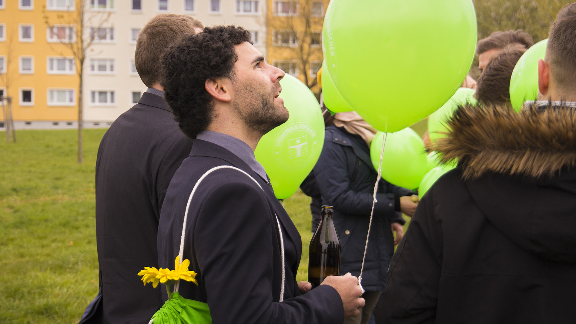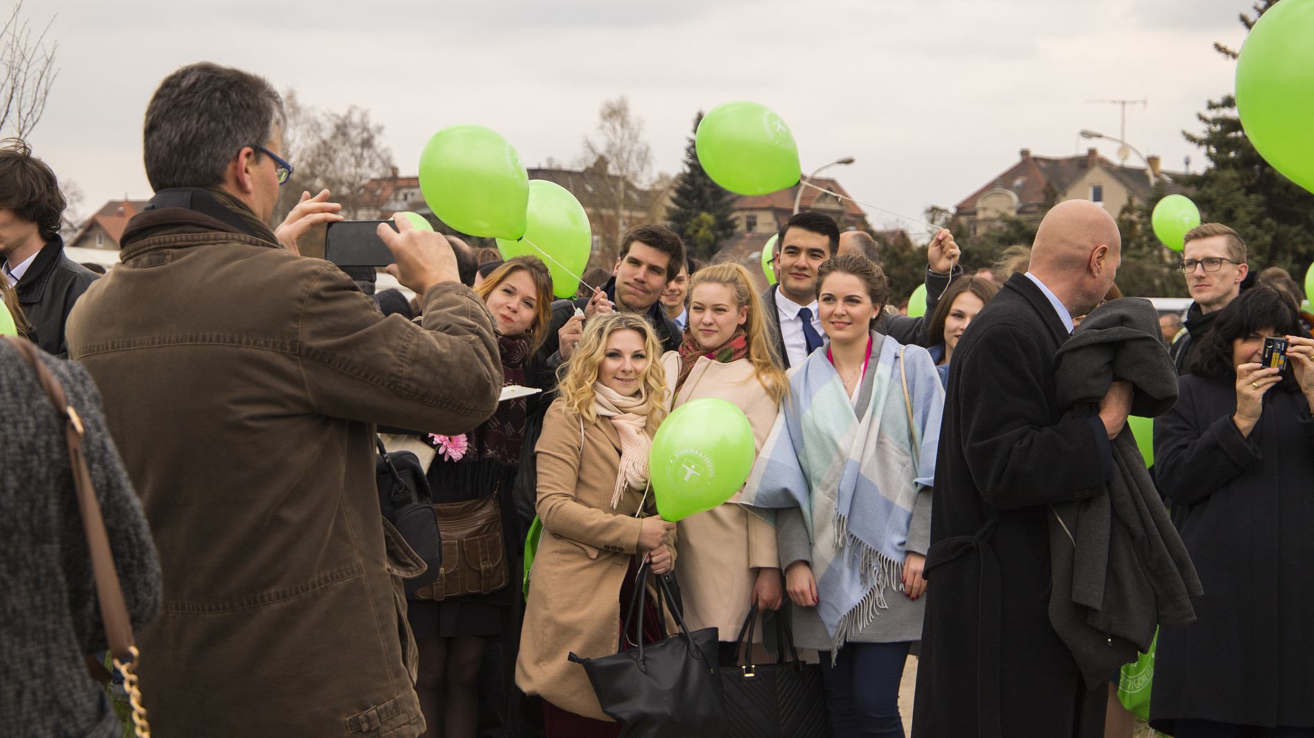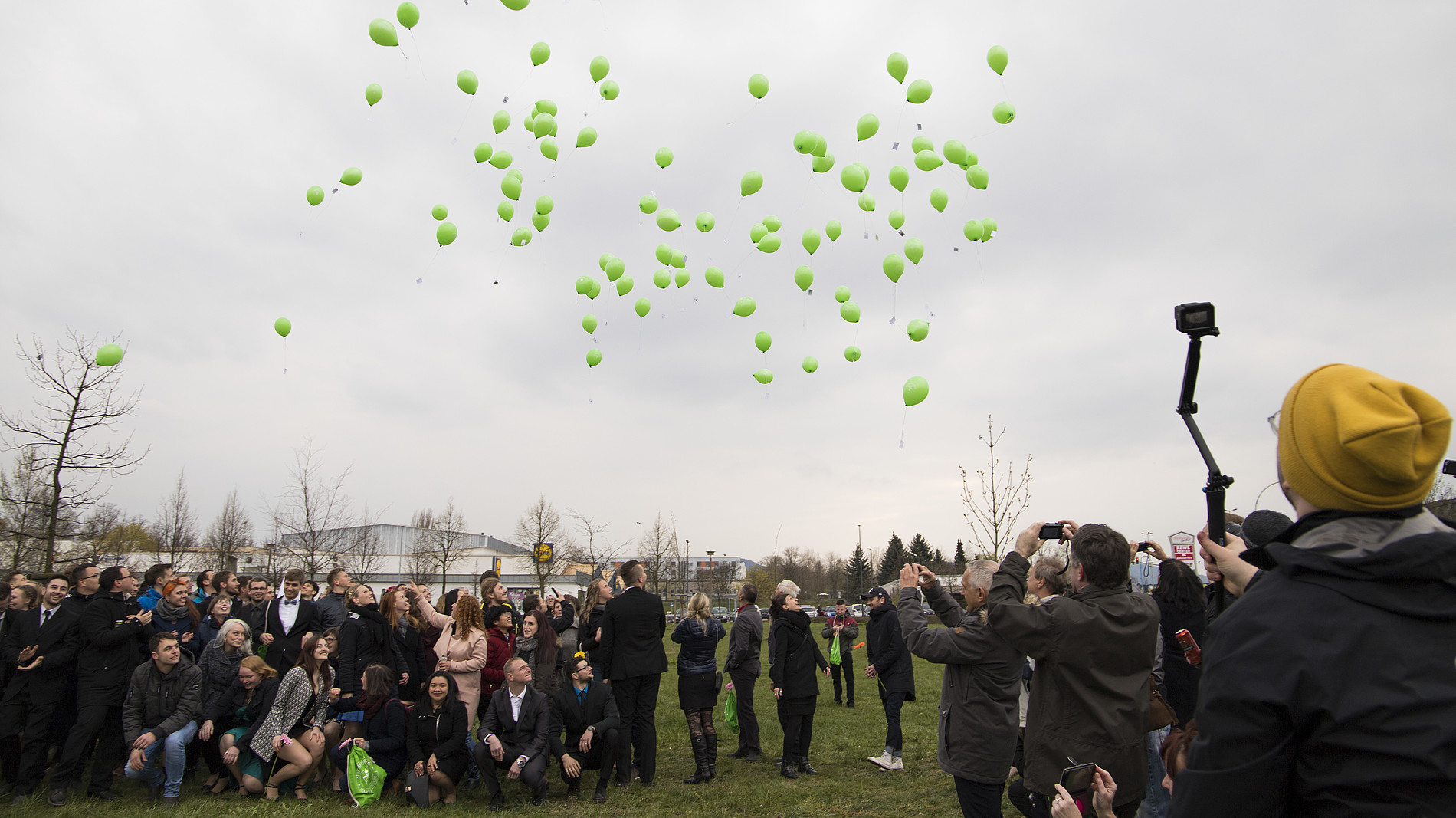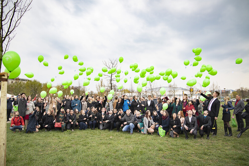 Die Band schönfisch bricht die feierliche Stille und bringt mit Klaviermusik, Kontrabass und elektronischen Klängen ein bisschen Sonne in die Aula. Das Aprilwetter kann an diesem Tag aber niemanden umhauen: hunderte von grünen Luftballons steigen nach der feierlichen Exmatrikulation in den Himmel, mit denen die AbsolventenInnen ihre Wünsche und Träume auf Wunschkärtchen versenden können. Die Berg-Ulme – der diesjährige Absolventenbaum – wird gepflanzt, angegossen und schließlich getauft, dann eben in Winterjacke. Es ist bereits der 41. Baum im Studentenpark. Es riecht nach Bratwurst, dank des Zittauer Senfladens und seinem Imbissstand, man prostet sich zu. Auf uns!