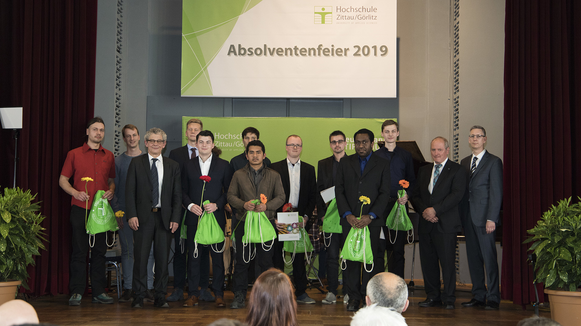 Denn „der Erfolg hat viele Väter und Mütter,“ der Rektor Professor Friedrich Albrecht weiß, dass ein gelungener Studienabschluss auch immer der Unterstützung von Familie und Freunden zu verdanken ist. Oberbürgermeister von Zittau, Thomas Zenker, schließt sich an und erinnert in seiner Rede an die Kulturhauptstadtbewerbung Zittaus – der Bürgerentscheid wird im Mai stattfinden – und an ein gemeinschaftlich gedachtes Europa: „Europa braucht Sie alle!“ Eine beeindruckende Rede hielt auch Ronald Schmidt, General Manager Industrial Steam (englisch für Betriebsleiter) der Siemens AG in Görlitz. Er beschreibt die emotionale Achterbahnfahrt der Siemens Werke in Görlitz in jüngster Vergangenheit. Vor allem die der Mitarbeiter. Viele der HSZG-Alumni arbeiten bei Siemens. „Treffen Sie die richtigen Entscheidungen“, endet Schmidt.