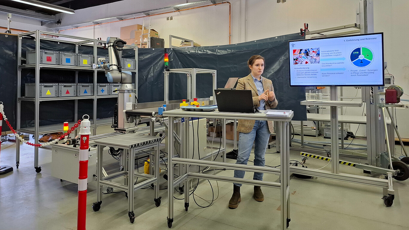 In ihrer Arbeit entwickelte Pauline Rechenberg ein modulares Robotersystem, das die kontinuierliche Erfassung und Analyse von Krankenhausabfällen ermöglicht. Der Versuchsstand kombiniert verschiedene hochkomplexe Systeme – darunter ein kollaborativer Roboter (Cobot), ein 2,5D-Kamerasystem, Förderbandtechnik, ein Vibrationsbunker zur Materialvereinzelung, Sensorik sowie ein Basissystem zur Integration kommender Multisensorkombinationen, die für die Werkstoffanalyse benötigt werden.