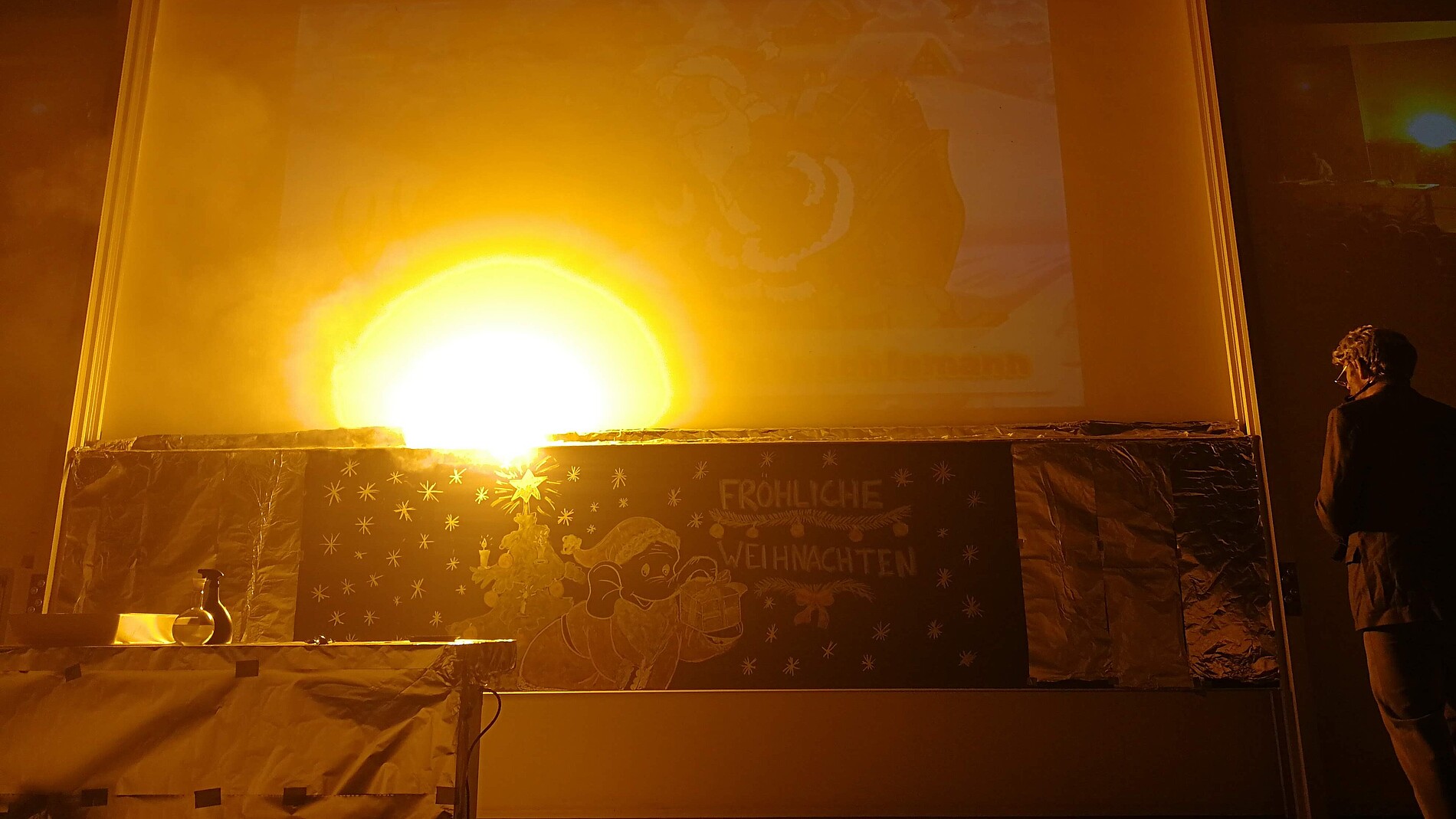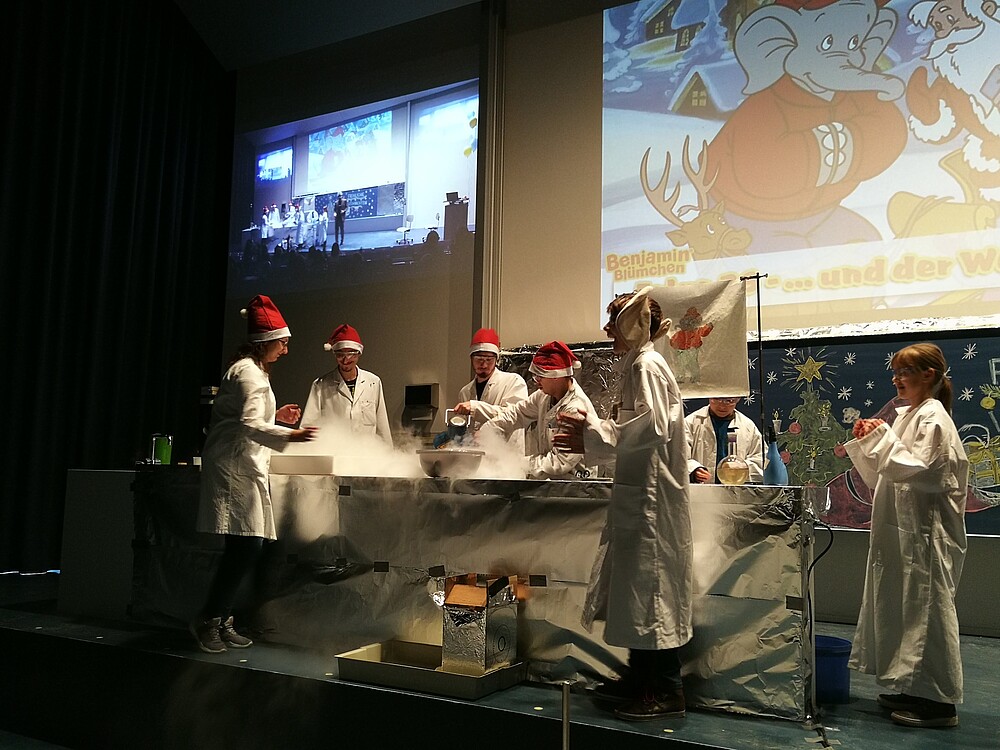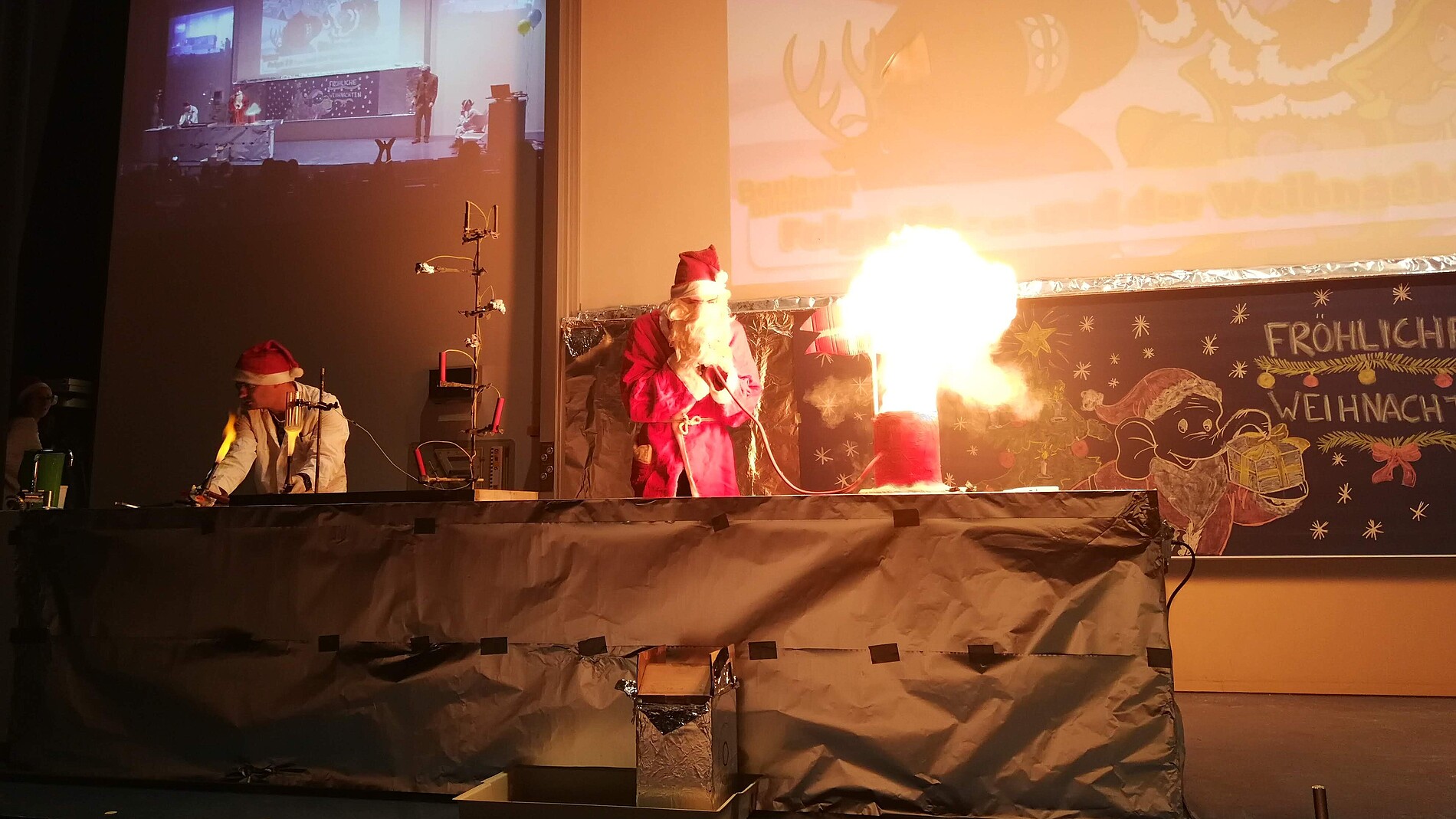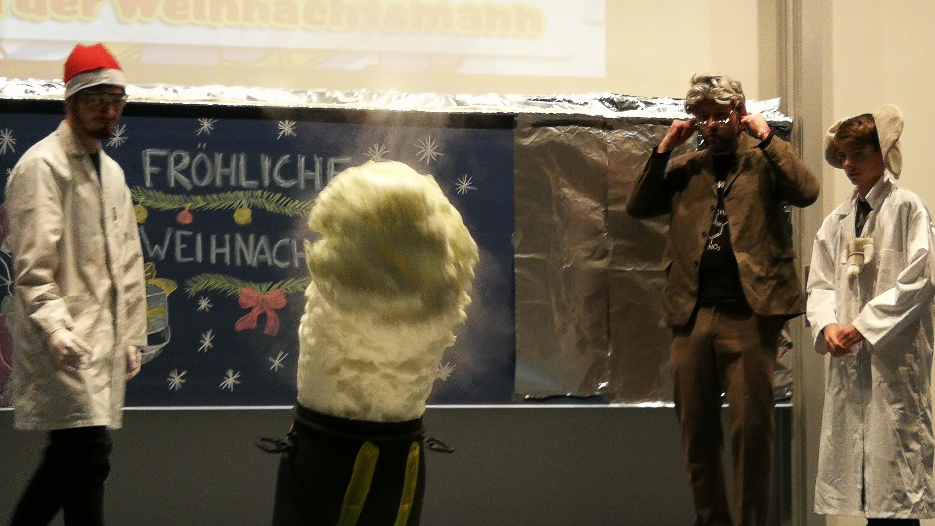 Die ca. 70 Kinder und Gäste im Hörsaal feierten natürlich mit und waren begeistert und interessiert bei der Sache. Bei einigen Versuchen durften sie sogar selbst in den Laborkittel schlüpfen und mitexperimentieren, zumal die Schauspielrollen in diesem Jahr ausschließlich mit Kindern aus dem Publikum besetzt wurden. Zu guter Letzt bekam jedes Kind auch noch ein kleines Geschenk vom Weihnachtsmann (Leon Müller) überreicht.
