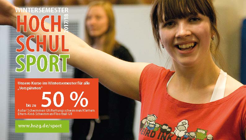 Für alle noch laufenden Kurse des aktuellen Sportprogramms gibt es ab sofort bis zu 50% Rabatt (der dann ausgewiesene Betrag ist der Rabattpreis). Link zur Einschreibung: www.hszg.de/campusleben/hochschulsport/angebot.html