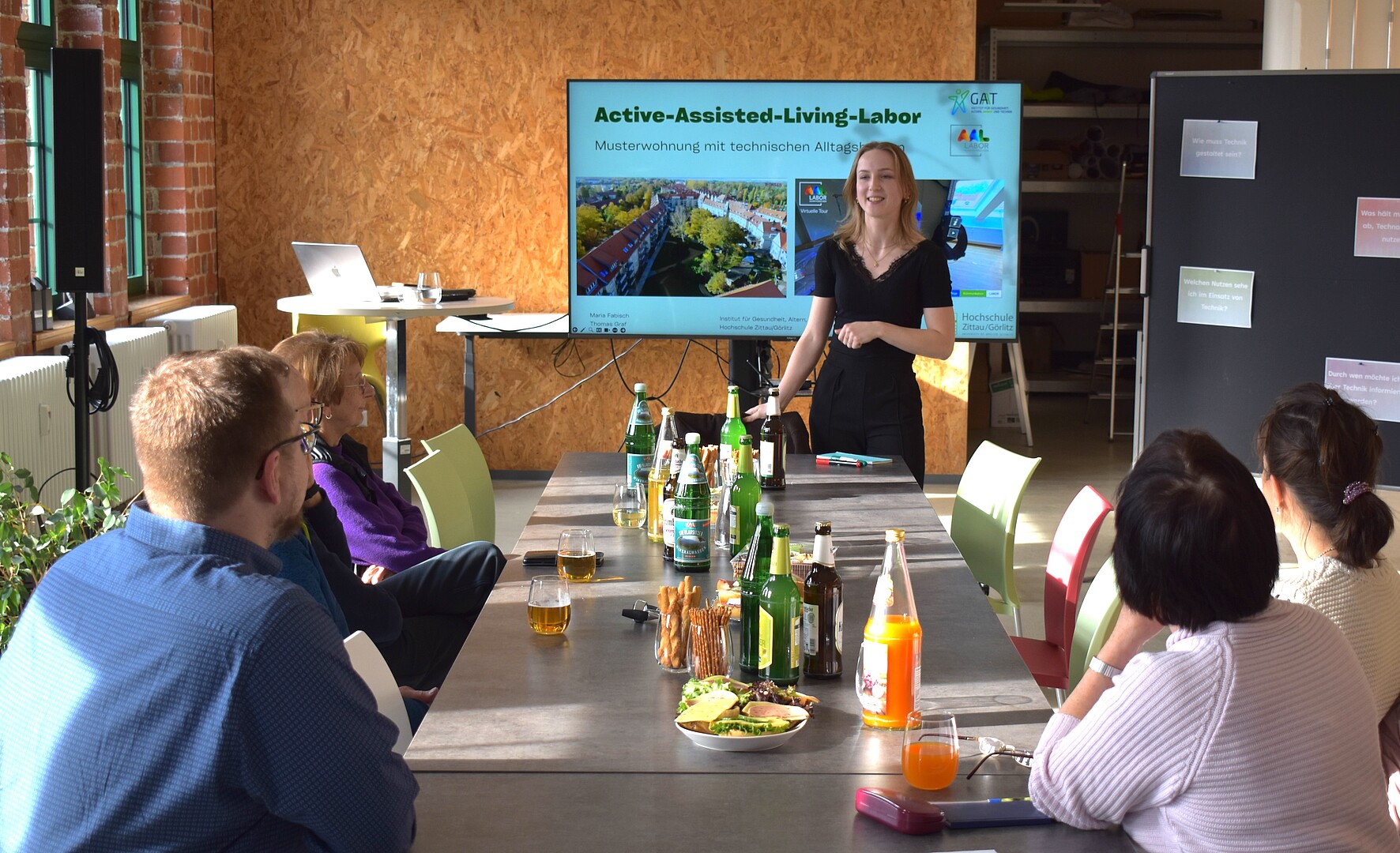 Die Veranstaltung bot Besucherinnen und Besuchern die Gelegenheit, neueste Entwicklungen aus dem Bereich Active Assisted Living (AAL) hautnah zu erleben. Besonders großes Interesse weckte die Präsentation von Maria Fabisch, Laborleiterin des gleichnamigen Forschungsbereichs. Sie stellte eine Musterwohnung vor, in der altersgerechte Assistenztechnologien praxisnah demonstriert werden – von Sicherheits- und Kommunikationshilfen bis hin zu gesundheitsfördernden Gadgets.