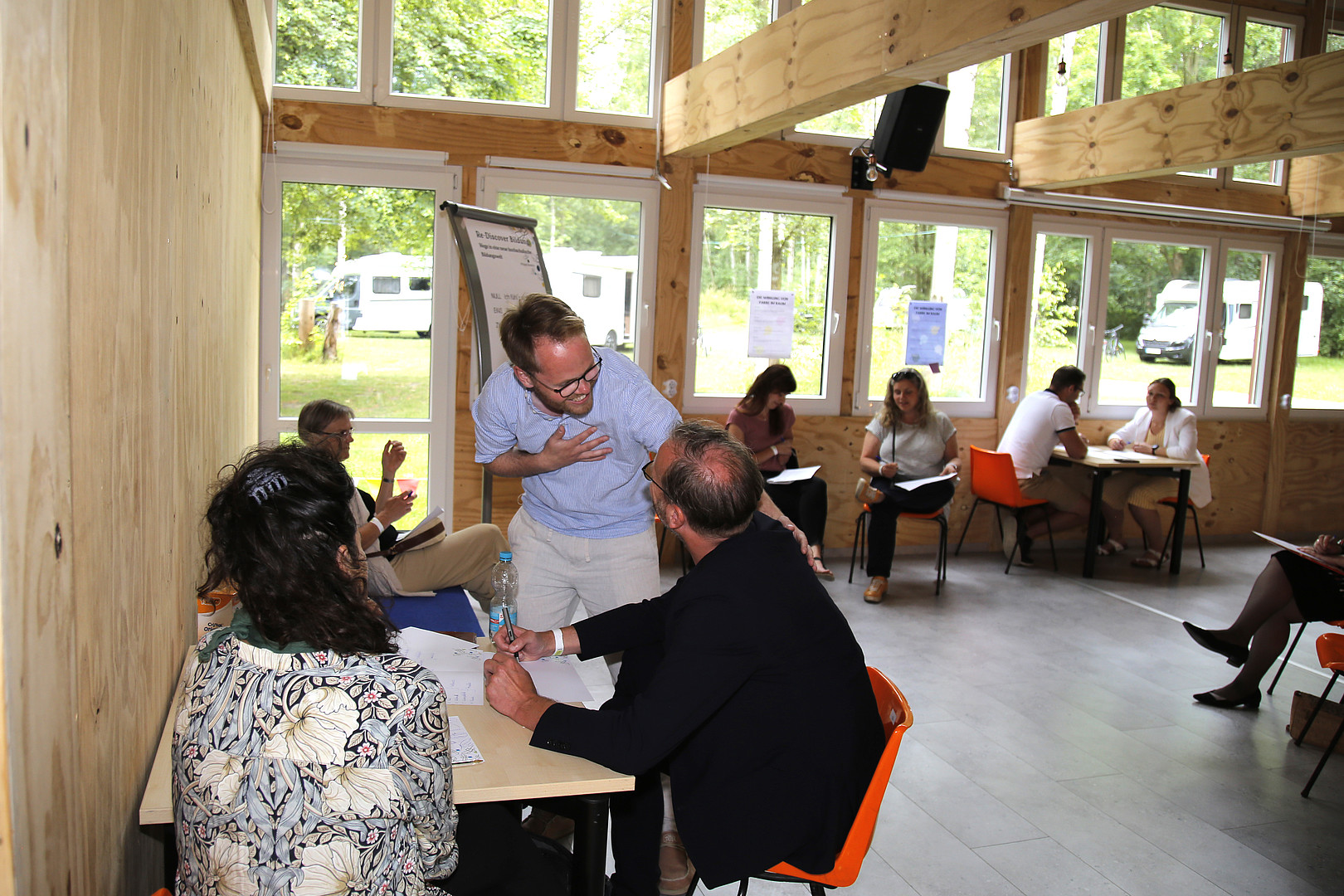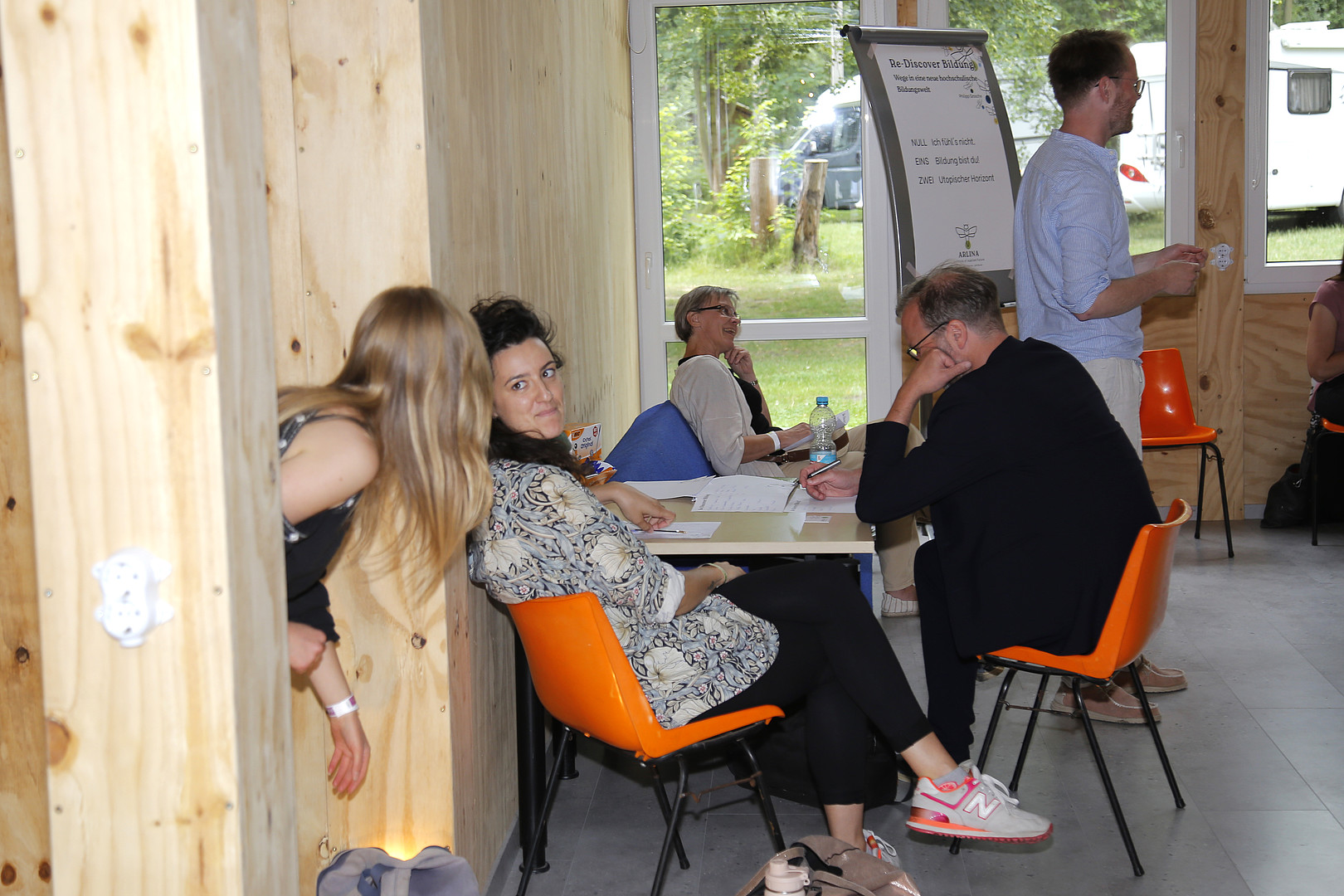Im Workshop „Raumnutzung“ von Dr. Dr. Dierk Suhr, Annekathrin Grünewald, Egmont Schreiter und Christian Tiller haben sich die Teilnehmenden an mehreren Stationen mit verschiedenen Lernräumen und Nutzungsszenarien befasst. An der Station „Grünes Klassenzimmer mit Makerspace“ wurde diskutiert, wie das grüne Klassenzimmer und der dazugehörige Makerspace in Zittau einladend gestaltet werden könnten. Dabei wurde auch erörtert, welche technische Ausstattung erforderlich ist, um möglichst viele Zielgruppen anzusprechen. Die Teilnehmenden waren sich einig, dass im grünen Klassenzimmer Hängematten, Outdoorsportgeräte und flexibel nutzbare Sitz- und Arbeitsmöbel nicht fehlen dürfen. Im Makerspace sollten Räume bzw. Zonen für unterschiedliche Zwecke (z. B. Musikzimmer, Sportraum, Ruheraum, Kreativraum) geschaffen und Kurse (z. B. Metall- und Holzbearbeitung, Nachhaltigkeit lehren und praktizieren) für verschiedene Zielgruppen angeboten werden. Ziel sollte es aus Sicht der Teilnehmenden sein, einen Ort zu schaffen, der zum kreativen Experimentieren, gemeinschaftlichen Ausprobieren und zum miteinander und voneinander Lernen anregt.