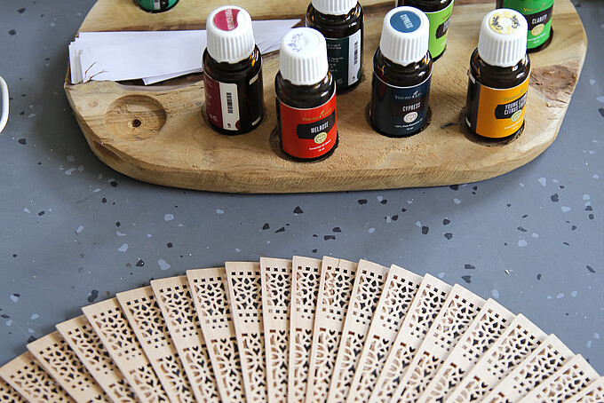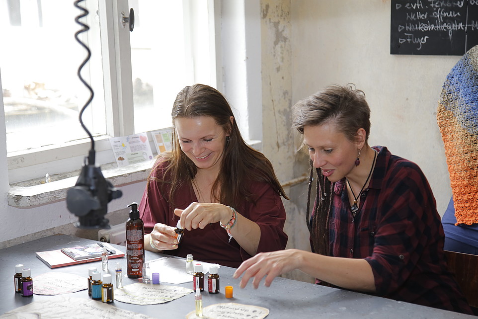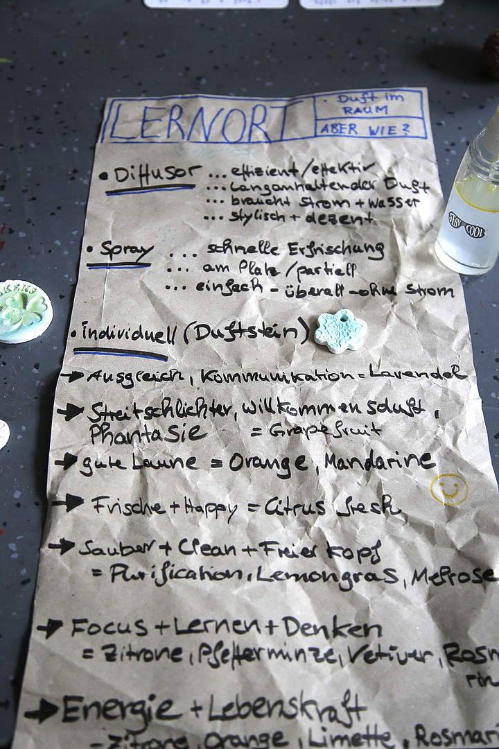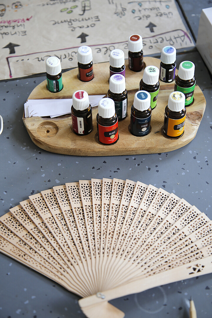 Die Studierenden sind bei der thematischen Auswahl der Workshopinhalte aber auch interessante neue Wege gegangen. So bot der Workshop „Lernatmosphäre durch Düfte“ von Kerstin Krone den Teilnehmenden beispielsweise die Möglichkeit, sich über die positiven Wirkungen von ätherischen Ölen auf Körper, Geist und Seele zu informieren. Überdies bot der Workshop viel Gelegenheit, sich über die eigenen Erfahrungen im Umgang mit Düften auszutauschen. In ihrem fachlichen Input erläuterte die Duftexpertin unter anderem, dass der Duft der Vetiver die Konzentration fördert, Lavendel zur Entspannung beiträgt und durch Rosamarin sich die Gedächtnisleistung steigern lässt. In einem Duftquiz konnten die Teilnehmenden dann auch selbst die Wirkung der Öle erleben und unter fachlicher Anleitung eigene Duftkreationen herstellen.