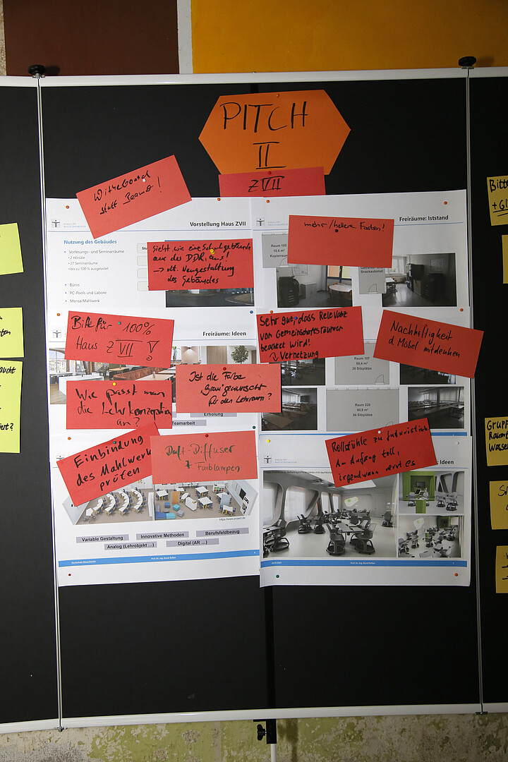 Im Workshop „Entwicklung innovativer Konzepte für die Gestaltung der Freiflächen am Campus in Zittau und Görlitz“ von Frau Prof.in Dr.in Sophia Keil, Sebastian Riedel und Christian Tiller haben Vertreter*innen aus den Fakultäten ihre Ideen und Konzepte für die Einrichtung innovativer Lehr-Lernräume und die Gestaltung der Freiflächen in fünf Pitches vorgestellt. Im Anschluss wurden die Vorschläge diskutiert. Die Pitches und die Feedbacks der Teilnehmenden haben gezeigt, dass die Lehr-Lernräume mit Pixelmöbeln ausgestattet werden sollten, da diese eine flexible Nutzung der Räumlichkeiten und die Erprobung moderner Lehr-Lern-Konzepte unterstützen. Bei der Einrichtung der Räumlichkeiten sollte zudem darauf geachtet werden, dass viele Grünpflanzen, moderne Beleuchtungssysteme, Wasserspender, Ruhezonen zum selbstständigen Lernen und Arbeiten bzw. Ausruhen, Besprechungsboxen, Freizeitmöglichkeiten und Sportangebote etc. mitgedacht werden.