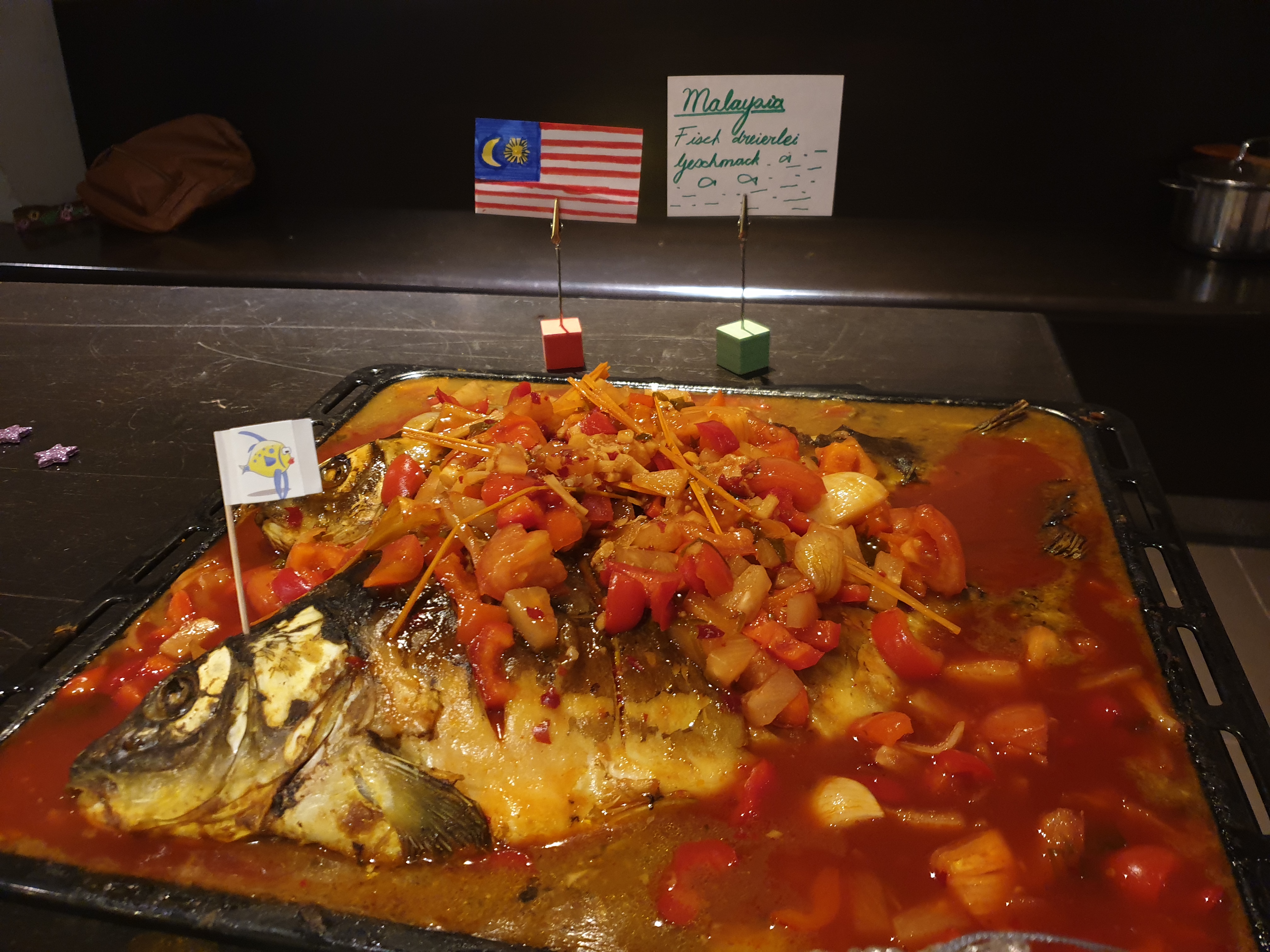 Bei dieser Veranstaltung haben viele Studierende aus unterschiedlichen Nationen typische Gerichte aus ihren Heimatländern vorbereitet und durften sich einmal quer um die Welt schlemmen. Das Buffet war außerordentlich bunt mit vielfältigen Gerichten: Nach malaysischem Rezept gegrillter Fisch, Reis mit Gemüse und Hähnchenfleisch aus Syrien, Bratnudeln aus Vietnam, besondere Süßigkeiten aus Peru und den USA sowie viele weitere interessante Gerichte. Auch für Vegetarier und Veganer gab es reichlich Auswahl am Buffet, wie zum Beispiel Fatah aus Palästina und Jordanien oder Kartoffelsalate aus Deutschland.