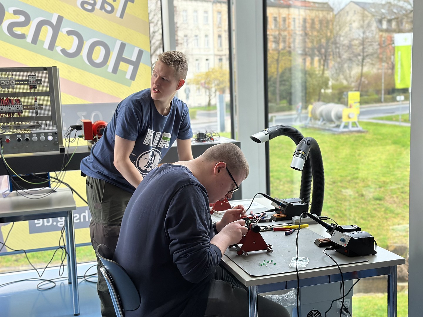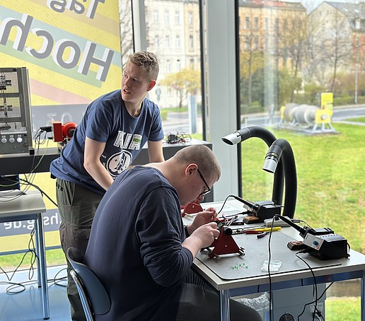 „Hands on“ stand auch im Mittelpunkt beim ‘kleinen Lötkurs‘. Dort lernten Interessierte an einer Lehrausbildung an der HSZG die notwendigen Arbeitsschritte zur Herstellung eines elektronischen Würfels kennen und kamen nebenbei mit Auszubildenden des dualen Studiums ins Gespräch.