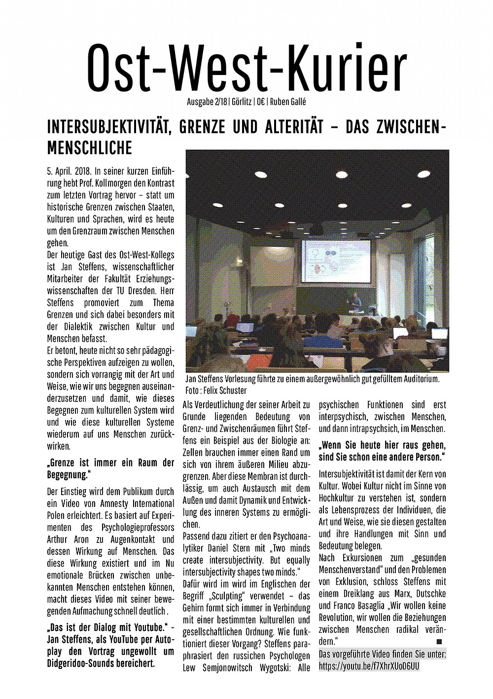 Die Ringvorlesung "Ost-West-Kolleg" der Hochschule Zittau/Görlitz widmet sich im Sommersemester 2018 dem Thema  "Der ostmitteleuropäische Raum: Alte und neue Grenz(überschreitung)en".  Die Ringvorlesung versammelt prominente Fachleute aus Wissenschaft, Politik und kultureller Praxis. Sie wird seit 1997 durchgängig von der (heutigen) Fakultät für Management- und Kulturwissenschaften im Rahmen der Studiengänge Kultur und Management Bachelor und Master angeboten, seit 2018 gemeinsam mit der Fakultät Sozialwissenschaften. Zur Dokumentation hat der Masterstudent Ruben Gallé ein interessantes Format entwickelt, das wir im folgenden präsentieren.