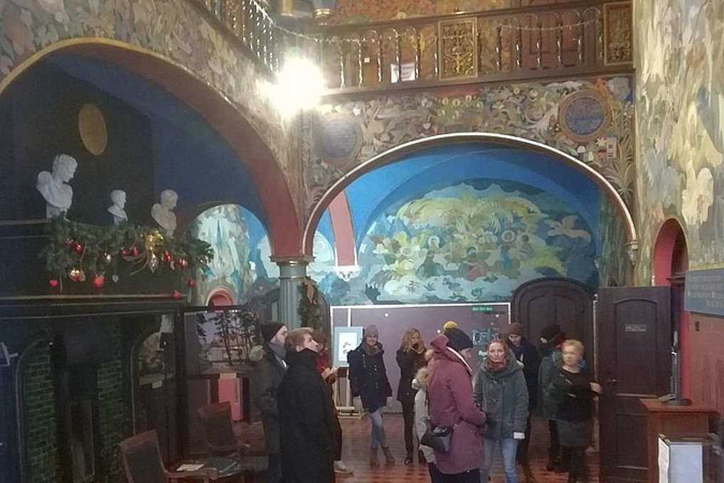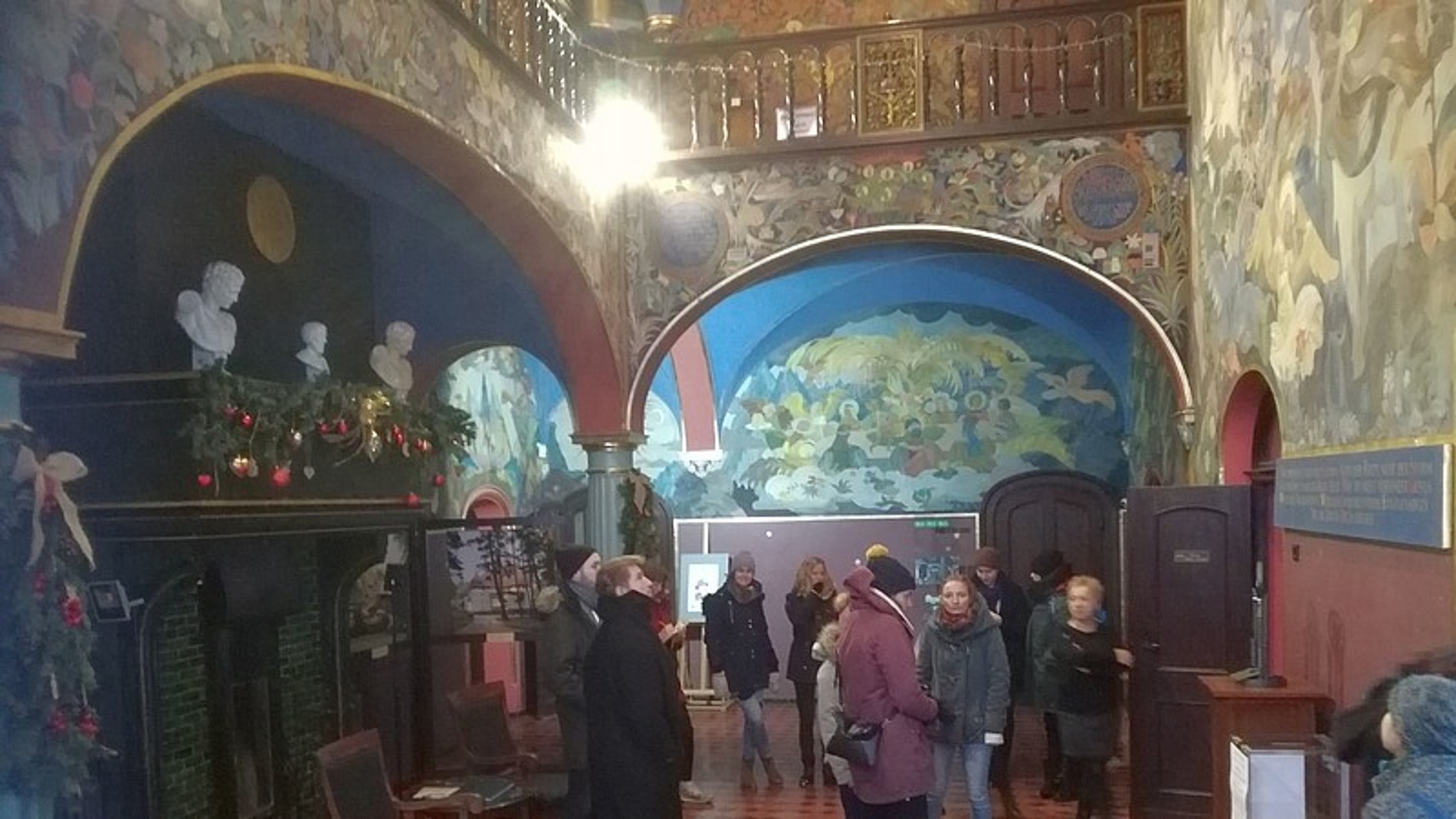 Im Haus des Literaturnobelpreisträgers von 1912 werden wir in der Eingangshalle – auch Paradieshalle genannt – empfangen, wo unser Augenmerk sofort auf die prächtige Wandbemalung gelenkt wird. Im Jahre 1922 schuf hier ein Freund Hauptmanns, der expressionistische Maler Johannes Maximilian Avenarius (übrigens auf dem Nikolaikirchhof in Görlitz begraben) acht Monate lang eine Wandmalerei mit verschiedensten Motiven und Symbolen aus der Bibel, unter anderem dem Sündenfall. Über dem Eingang des ehemaligen Musikzimmers, heute Raum für eine temporäre Ausstellung über Maria Konopnicka (die viele der Werke Hauptmanns vom Deutschen ins Polnische übersetzte), ist ein Geige spielender Engel dargestellt: eine Hommage an Margarete, Hauptmanns zweite Frau.