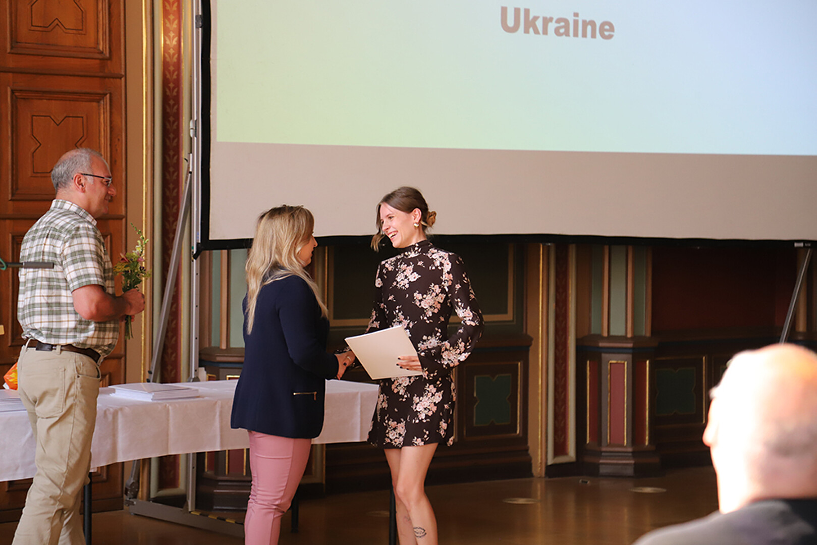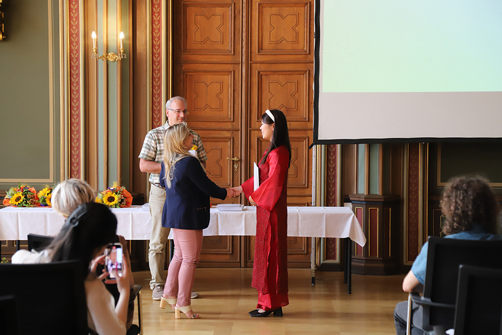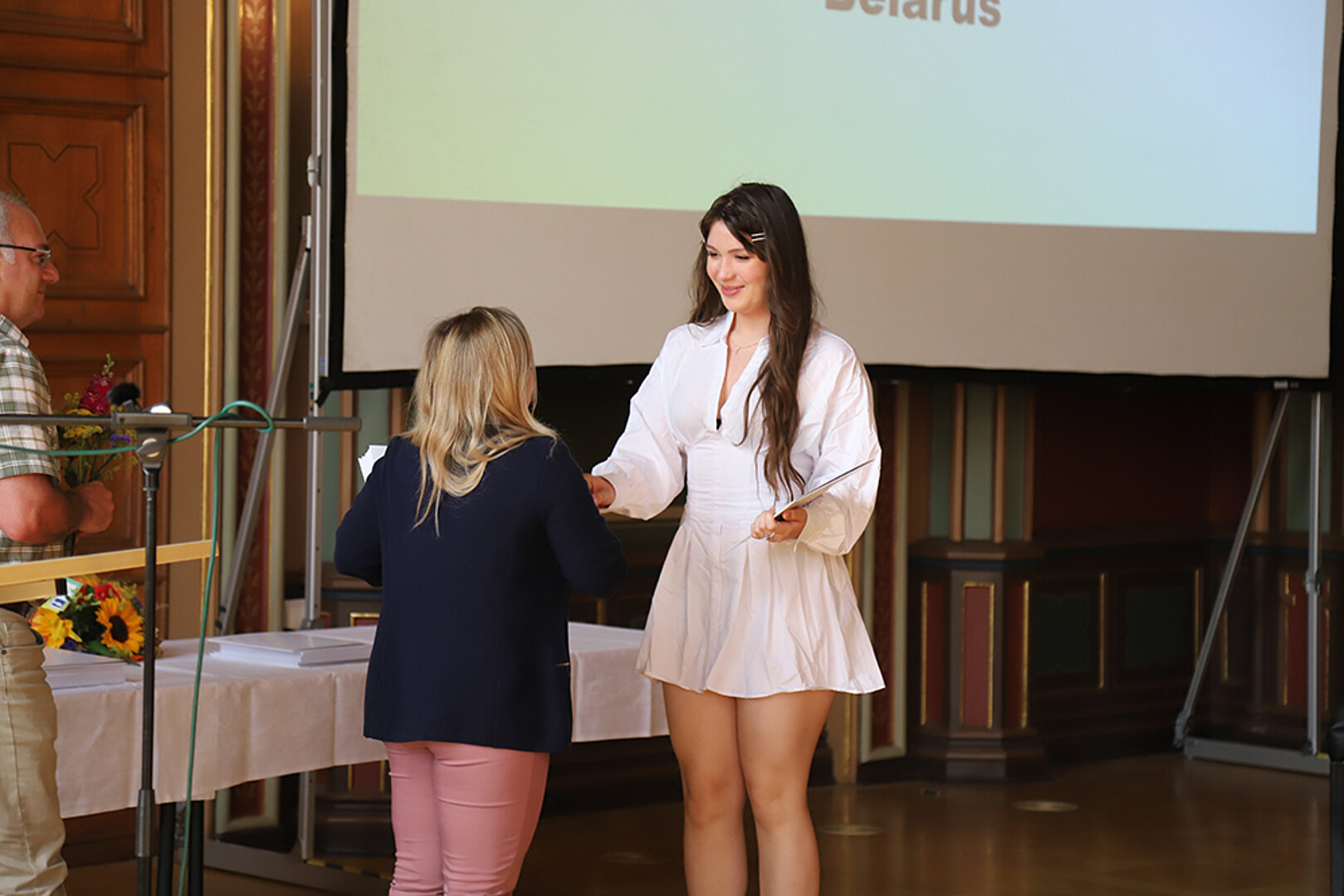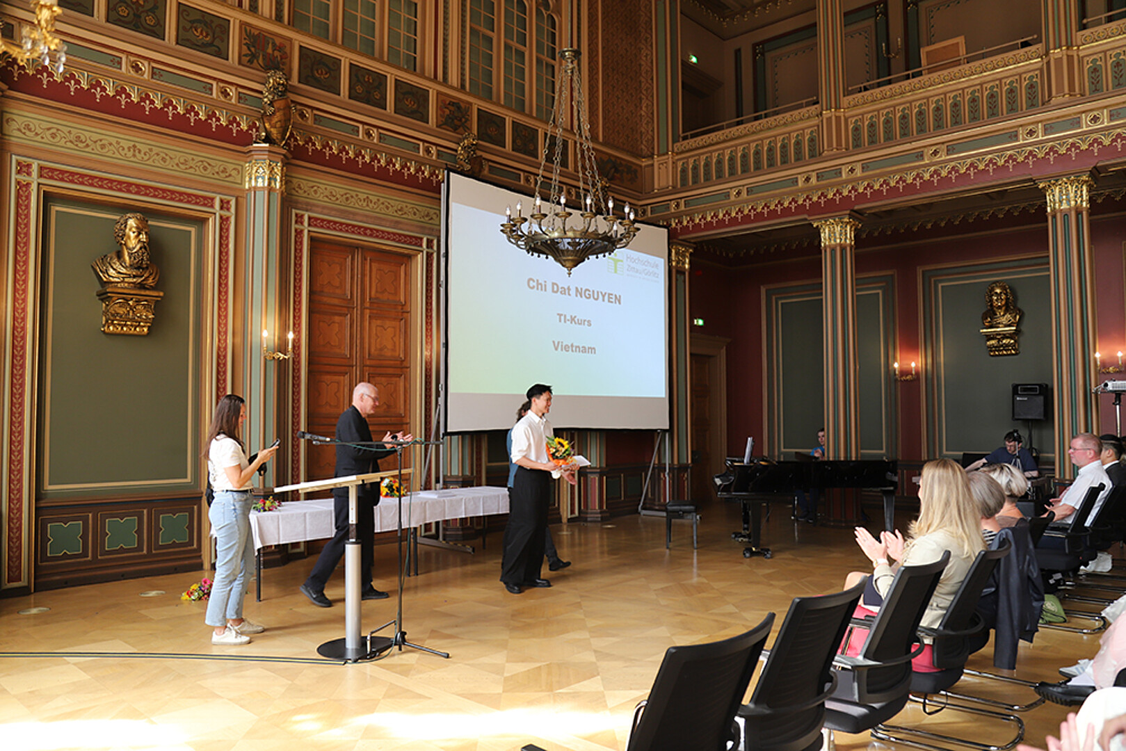 Eine besondere Würdigung erfuhren Olha Karpenko aus der Ukraine, Kim Nhat Minh Ngo aus Vietnam, Chi Dat Nguyen aus Vietnam und Natalia Kudasheva aus der Russischen Föderation, die als Beste bzw. Bester ihre jeweiligen Kurse abschlossen. Im Anschluss an die Zeugnisübergabe beeindruckte die Ukrainerin Olha das Publikum mit ihrem Gesang.