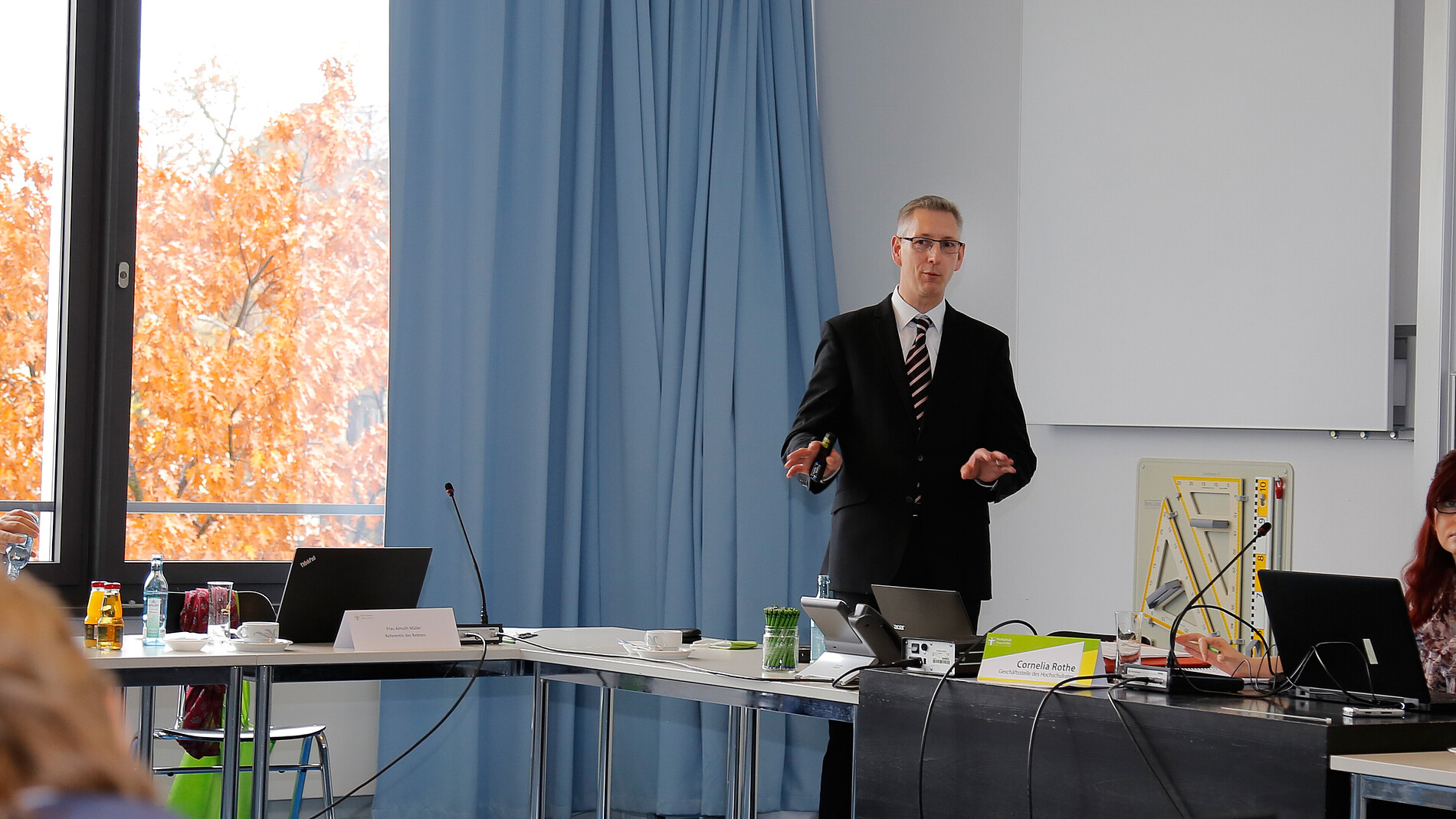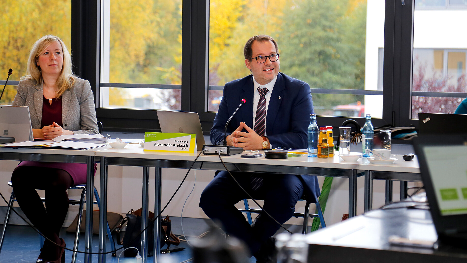 Diese Mitgestaltung stellt auch das erklärte Ziel der Studierendenschaft der Hochschule dar, wie es Lucas Wünsche vom Studierendenrat im Anschluss hervorhob. Er stellte in seiner Präsentation nicht nur die gute Zusammenarbeit zwischen dem StuRa und dem Rektorat – gerade auch in Zeiten pandemischer Herausforderungen – heraus, sondern transportierte die empfundene Notwendigkeit und Sehnsucht der von ihm repräsentierten Studierenden nach interdisziplinären, projektorientierten Bildungskonzepten.
