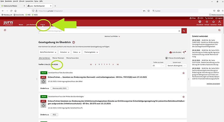 Das juris PreLex Modul ermöglicht den einfachen und schnellen Überblick über aktuelle Gesetzgebungsverfahren des Bundes. Damit bietet das Modul frühzeitige Informationen über sich abzeichnende Rechtsänderungen. Es informiert über den Entstehungsprozess von Gesetzen und Verordnungen. Sobald der Entwurf als Drucksache vorliegt, werden die wesentlichen Stationen und relevanten Dokumente des Werdegangs sowie das Gesetz aufbereitet und in der Datenbank bereitgestellt. Gegenwärtig finden sich 6.200 Einträge (Stand: 1/2022).