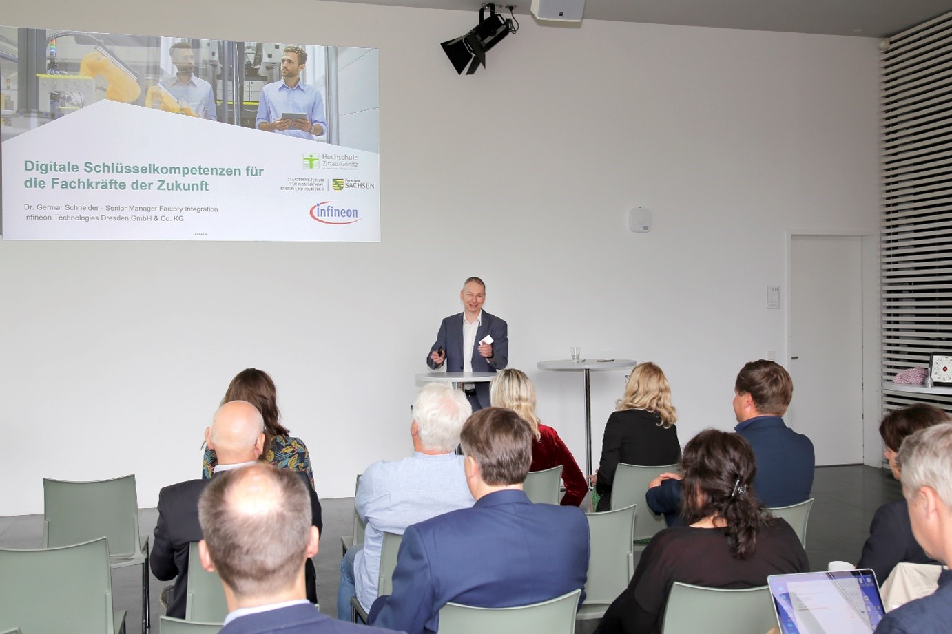 Bei der Veranstaltung präsentierte Herr Dr. Germar Schneider von Infineon Technologies, Dresden, einen Impulsvortrag über digitale Schlüsselkompetenzen für zukünftige Fachkräfte aus Sicht der Unternehmen. Herr Dr. Schneider beleuchtete dabei den Wandel der Arbeitsplätze in der Halbleiterindustrie durch Automatisierung und stellte zugleich innovative Ideen zur Arbeitsgestaltung der Zukunft vor. Sein Beitrag war äußerst bereichernd und bot wertvolle Einblicke in die Anforderungen und Möglichkeiten für Fachkräfte in der digitalen Welt.