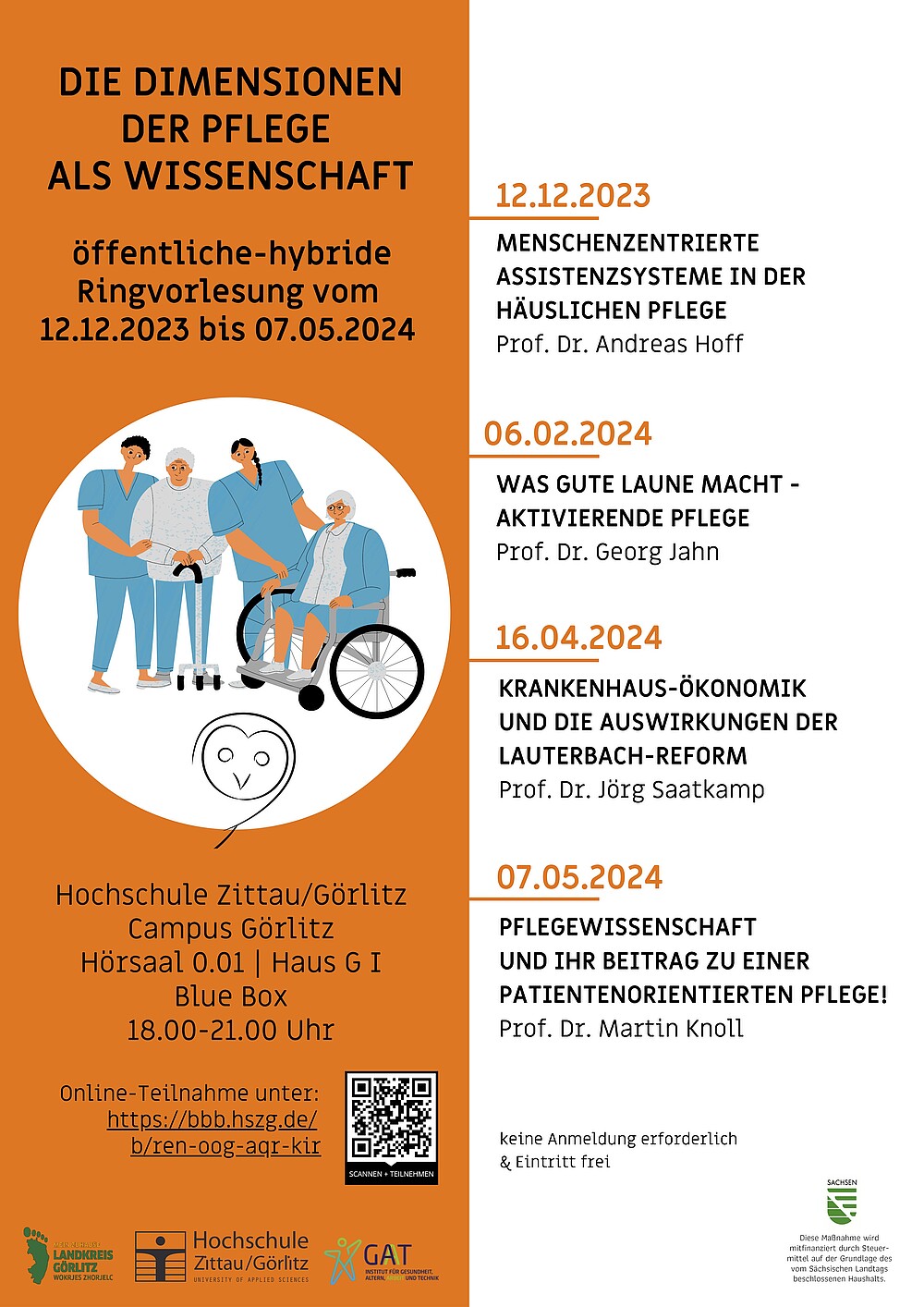 Im Rahmen der Vorlesungsreihe „Die Dimensionen der Pflege als Wissenschaft“, die vom Landkreis Görlitz unterstützt wird, stellen Wissenschaftler und Wissenschaftlerinnen aktuelle Themen und Forschungsergebnisse der Disziplin Pflege und aus pflegerelevanten Feldern vor. Die Vorlesungen richten sich an alle Interessierten auch ohne Vorkenntnisse und finden in hybrider Form statt. Interessierte können sich also entscheiden ob sie in Präsenz am Campus der HSZG in Görlitz an der Vorlesung teilnehmen oder online von zu Hause aus. Im Anschluss an die Vorträge besteht die Möglichkeit zur Diskussion.