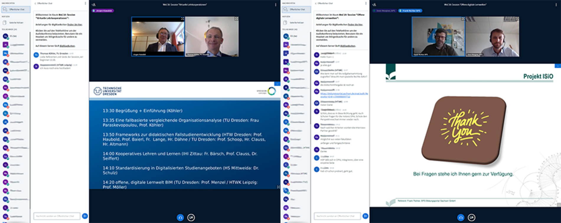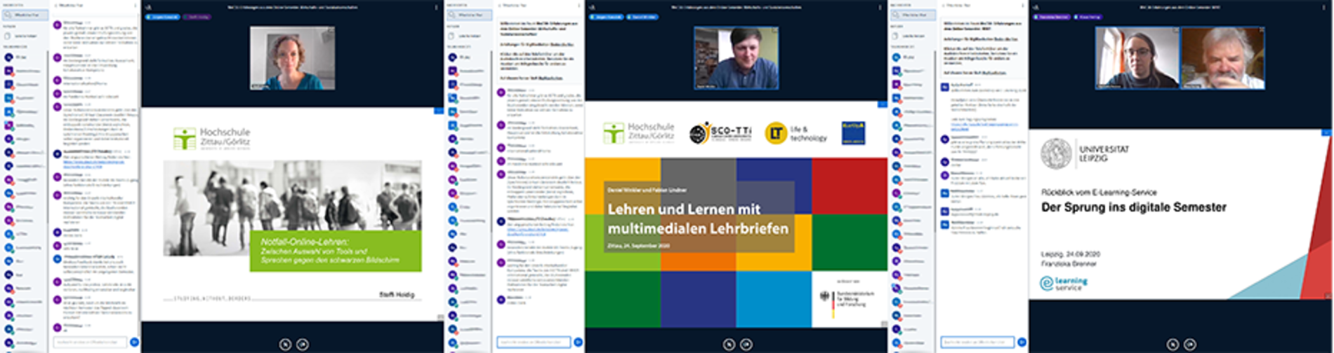 In zwei parallel sich anschließenden Sessions präsentierten Lehrende aus verschiedenen sächsischen Hochschulen ihre Erfahrungen aus dem vergangenen „Corona-Semester“. Die „MINT-Session“ gab Interessierten einen Einblick in die virtuelle Lehre der Ingenieurswissenschaften und den interaktiven Möglichkeiten in der Mathematikausbildung. In der Session „Wirtschaft- und Sozialwissenschaften“ fanden die Teilnehmerinnern und Teilnehmer ein breites Spektrum an Vorträgen wie Erfahrungen zur virtuellen internationalen Teamarbeit oder dem Einsatz von multimedialen Lehrbriefen. Gleich drei Lehrende der HSZG, Frau Dr. Steffi Heidig, Herr Daniel Winkler und Herr David Sauer, präsentierten hier in Impulsvorträgen ihre Erfahrungen und „Lessions Learned“ aus dem Online Sommersemester 2020.
