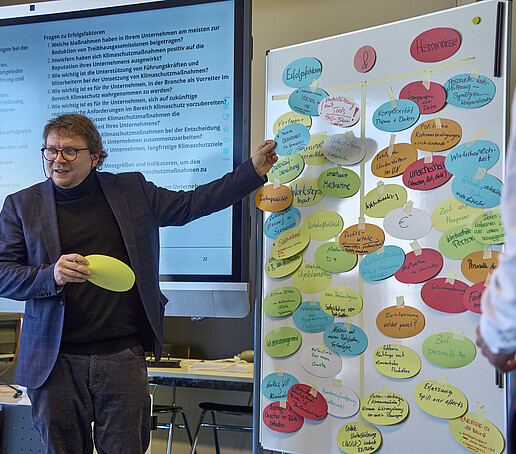 Im Rahmen unseres Abschlussworkshops Ende Januar 2025 haben wir gemeinsam mit den teilnehmenden Unternehmen den Status der Projektziele resümiert sowie in einem Workshop Erfolgsfaktoren und Herausforderungen für Unternehmen auf dem Weg zur Klimaneutralität reflektiert. Dabei wurde klar: Der wichtigste Erfolgsfaktor war die intensive und kontinuierliche Zusammenarbeit zwischen den Unternehmen und dem Projektteam der Hochschule. Ob individuelle 1:1-Betreuung beim Umgang mit dem THG-Tool, informative Workshops zu politisch-rechtlichen Neuerungen oder aktuelle Informationen zum State of the Art der Klimaschutzmaßnahmen – der Austausch und das gemeinsame Wissen waren der Schlüssel zum Erfolg. Ohne dieses Projekt – so waren sich alle Unternehmen einig - wären sie niemals dahin gekommen, wo sie heute in Bezug auf das Thema Klimamanagement stehen.