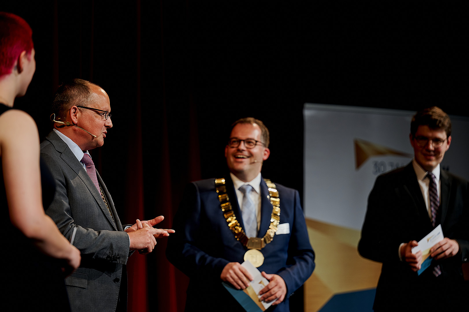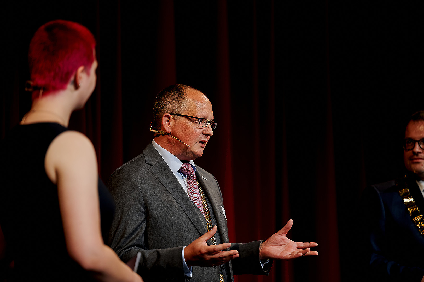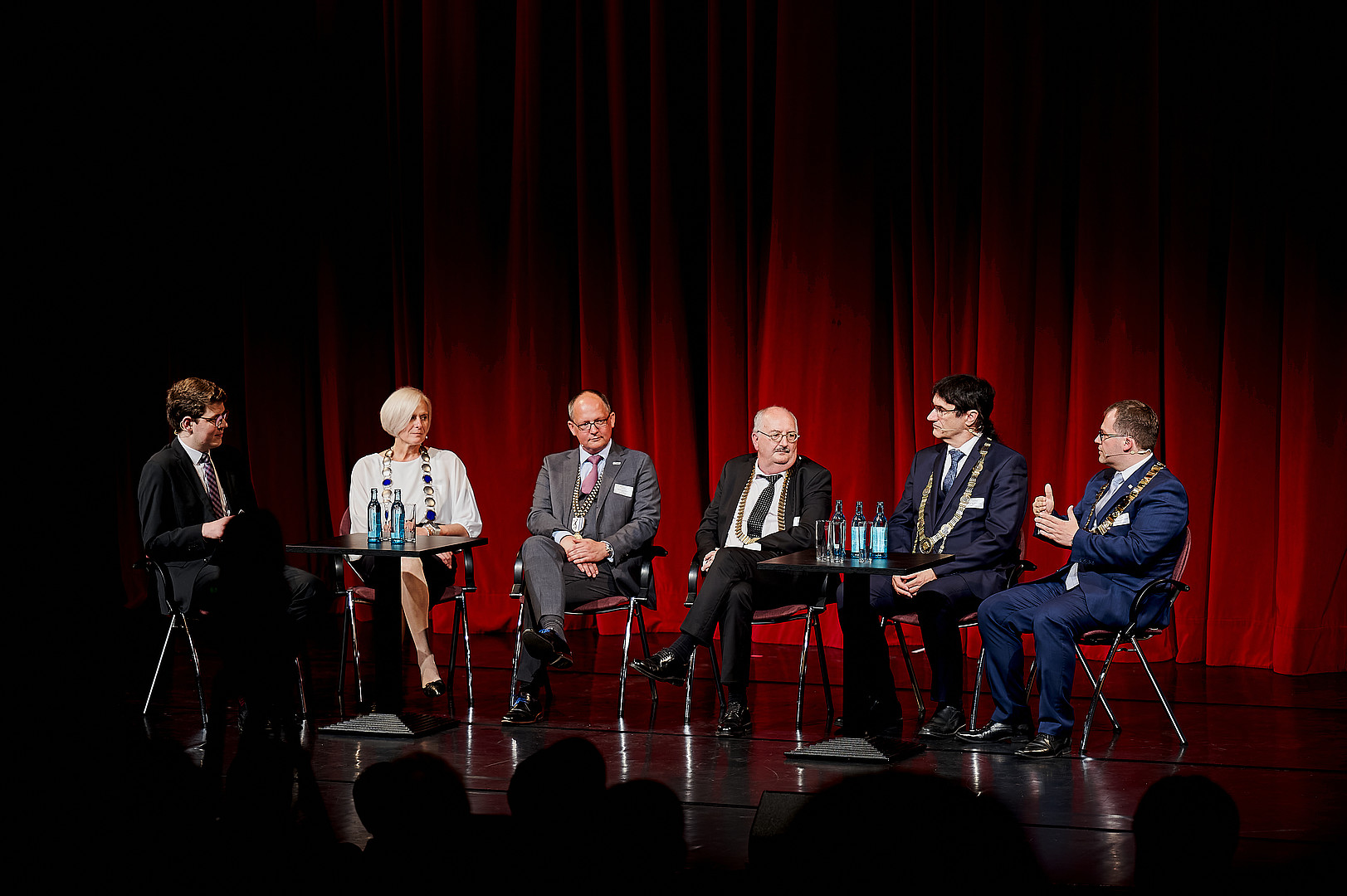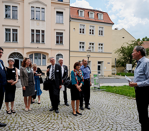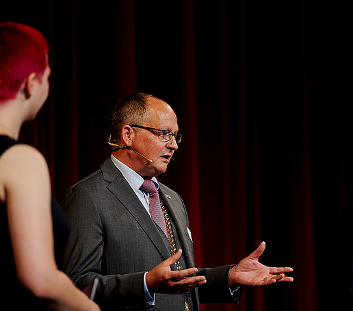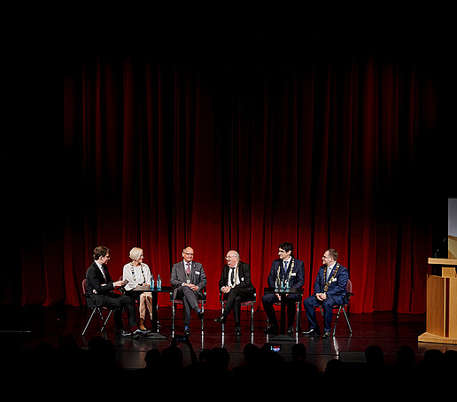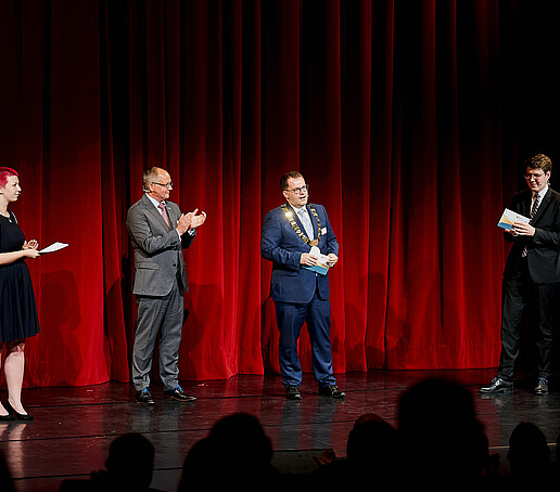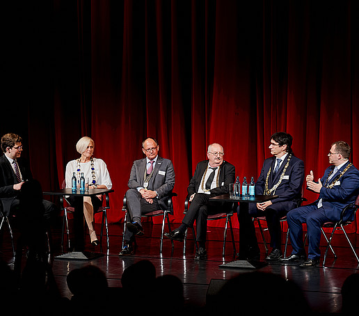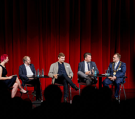 In der anschließenden Gesprächsrunde zum Thema „Willkommen in der Dreiländerregion“ setzten sich der Oberbürgermeister der Stadt Zittau Thomas Zenker, der Rektor der Hochschule Zittau/Görlitz Prof. Alexander Kratzsch, der Schauspieldirektor des Gerhart-Hauptmann-Theaters (GHT) Görlitz-Zittau Ingo Putz und der Leiter des Studierendenensembles am GHT Görlitz-Zittau Eike Zastrow mit der Bedeutung der Hochschule und des Theaters für die Region sowie der Besonderheit der Lage im Dreiländereck auseinander.