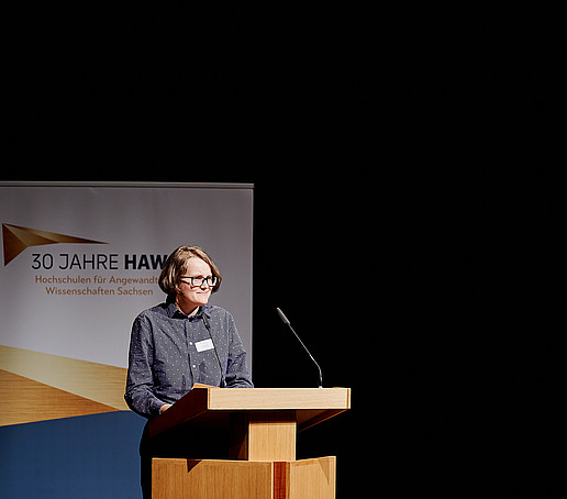 Wünsche an die Politik sowie an die Hochschulleitungen äußerte auch Uta Lemke, Sprecherin der Konferenz Sächsischer Studierendenscha­ften (KSS). In ihrem Redebeitrag „Vision: Die HAW der Zukunft" warf sie einen kritischen Blick auf die besondere Rolle der HAW Sachsen, vor allem in Hinblick auf die Abgrenzung zu großen Universitäten. Die Sprecherin der KSS forderte eine gewährleistete Ausfinanzierung sowie Dauerstellen für Daueraufgaben, mehr didaktische Weiterbildung der Dozierenden und mehr Fokus auf die Lehre. An die Hochschulleitungen appellierte sie, sich auf die eigenen Bedarfe zu konzentrieren und auf Missstände hinzuweisen.