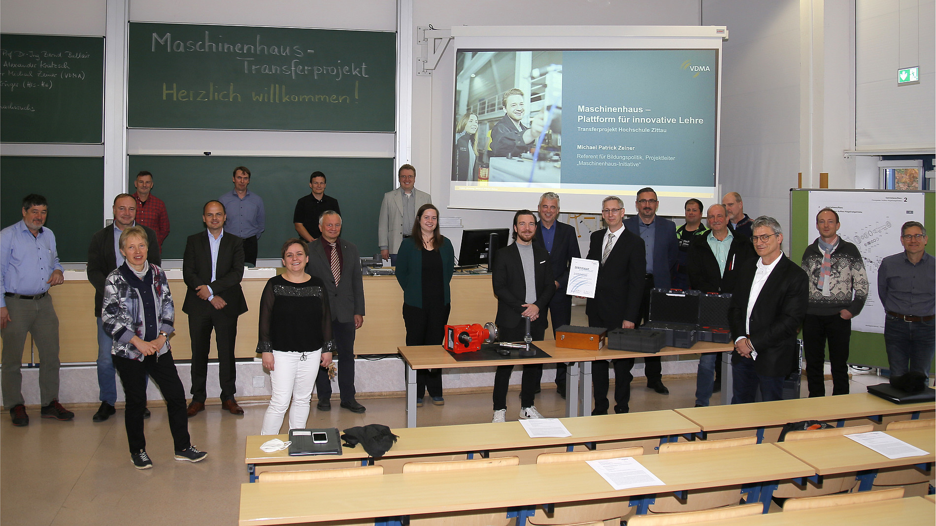 Michael Patrick Zeiner, Projektleiter der Maschinenhaus-Initiative des VDMA, lobte in seiner Rede beim Abschlussworkshop die erzielten Projektergebnisse: „Die Unternehmen suchen Berufsanfängerinnen und -anfänger, die schon im Studium damit begonnen haben, exemplarische Aufgaben aus der beruflichen Praxis mit einem steigenden Grad von Eigenverantwortung für die Problemlösung und die Ergebnisse zu bearbeiten. Mich freut es daher sehr, dass in Zittau mit großem Engagement mit Lehrobjekten und E-Learning-Angeboten, aber auch unter Ausnutzung von Unternehmenskontakten, derartige Angebote nun ermöglicht werden.“ Als Auszeichnung für die erfolgreiche Teilnahme an einem Transferprojekt und zur Würdigung des Engagements der Fakultät für Maschinenwesen, überreichte er der Hochschule Zittau/Görlitz im Anschluss das VDMA „Maschinenhaus-Zertifikat“.