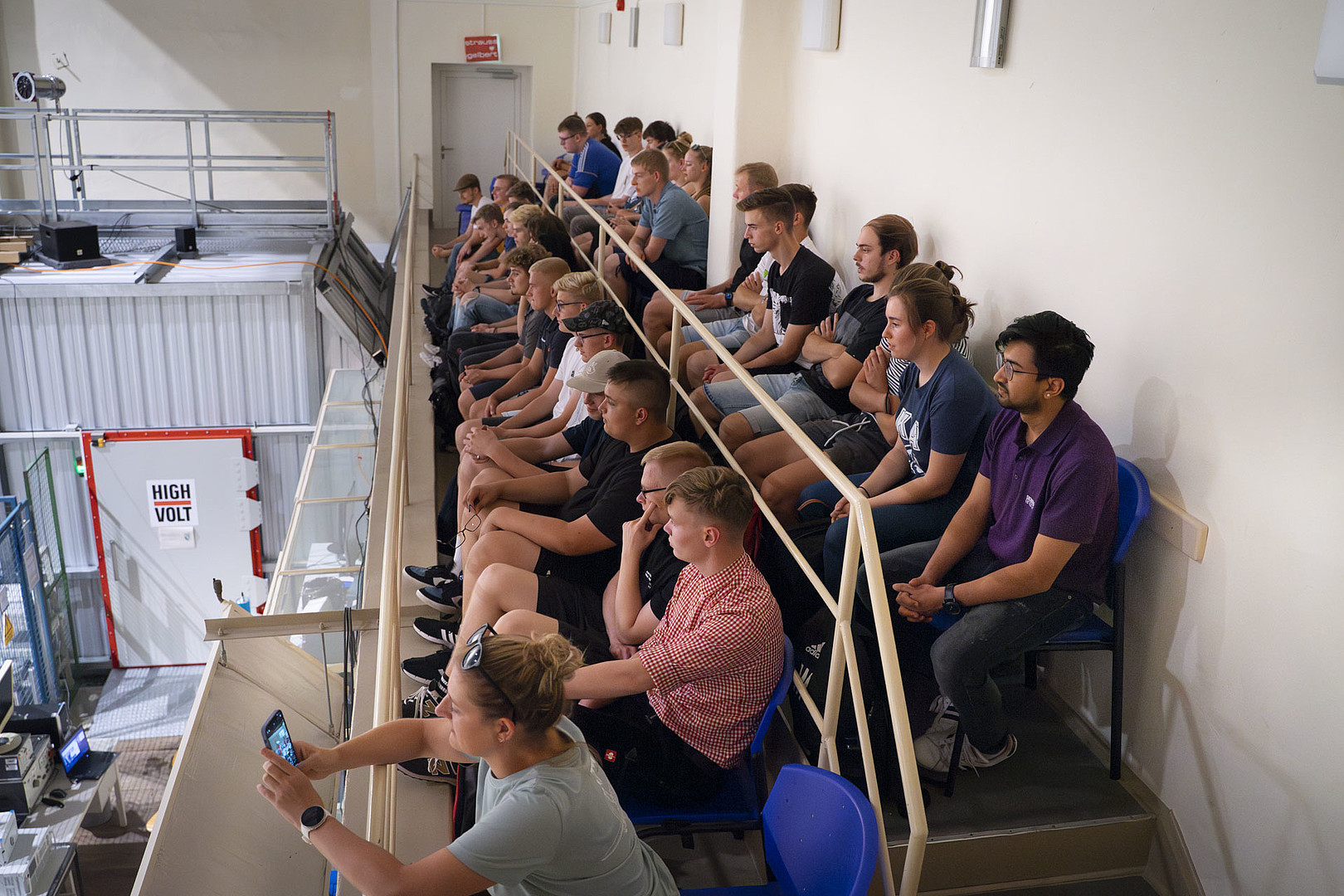 Nach einer inspirierenden Willkommensrede von Rektor Prof. Dr. – Ing. Alexander Kratzsch und der KIA-Beauftragten Kristin Groß begab sich die aufgeregt gestimmte Gruppe in die Hochspannungshalle der Hochschule. Dort wurden sie von Rüdiger Cervinka und seinem Kollegen Mario Dreßler begrüßt, die mit spannenden und spektakulären Experimenten einen Vorgeschmack auf das kommende Studium boten.