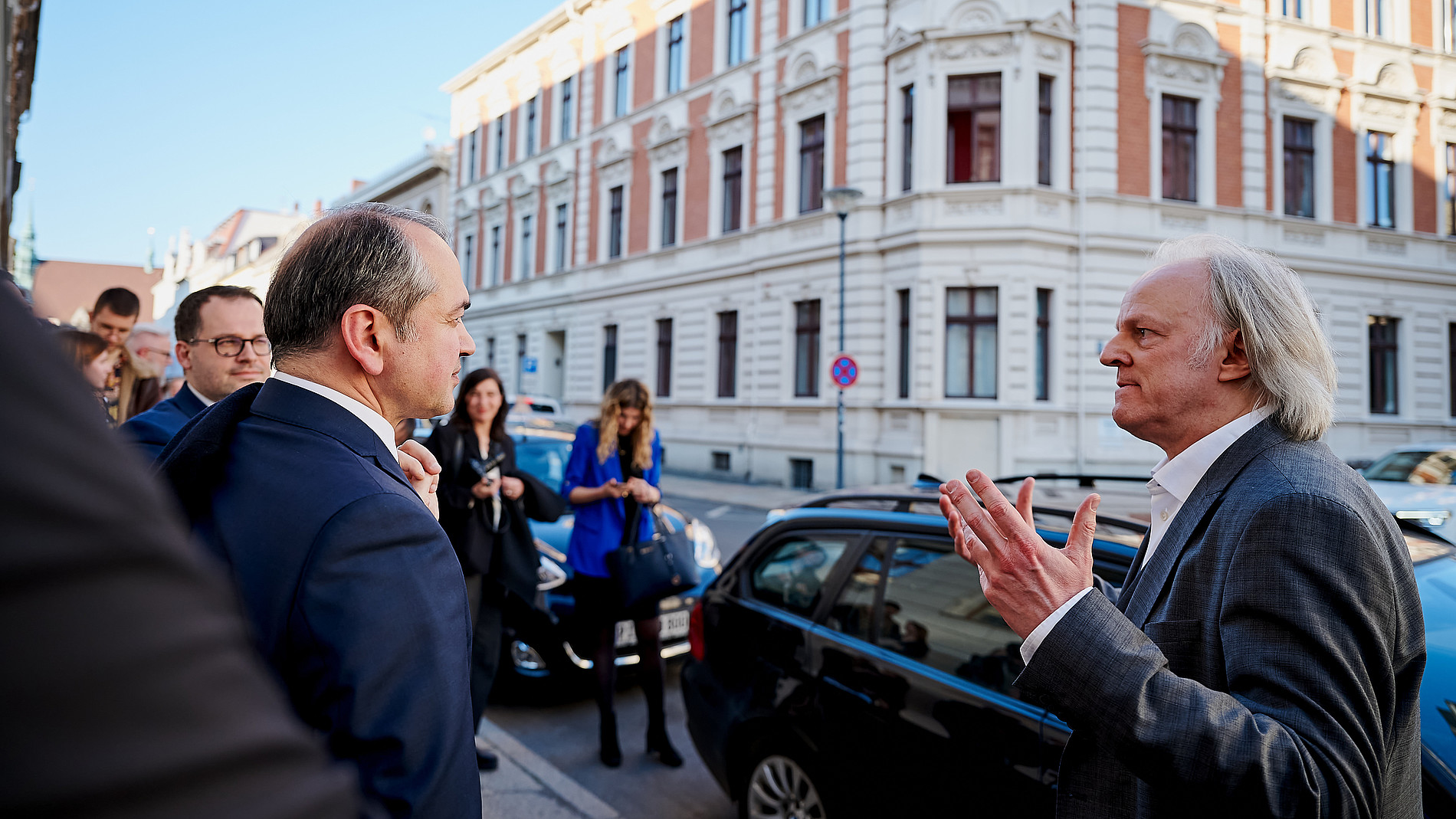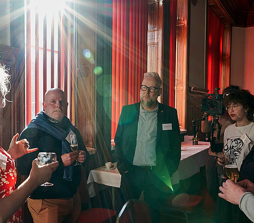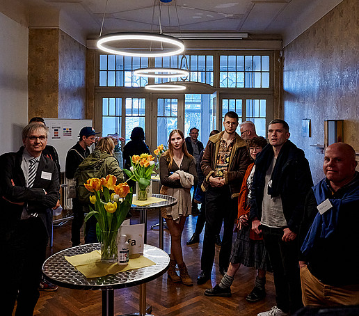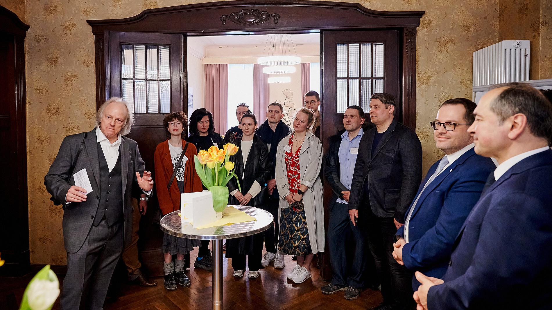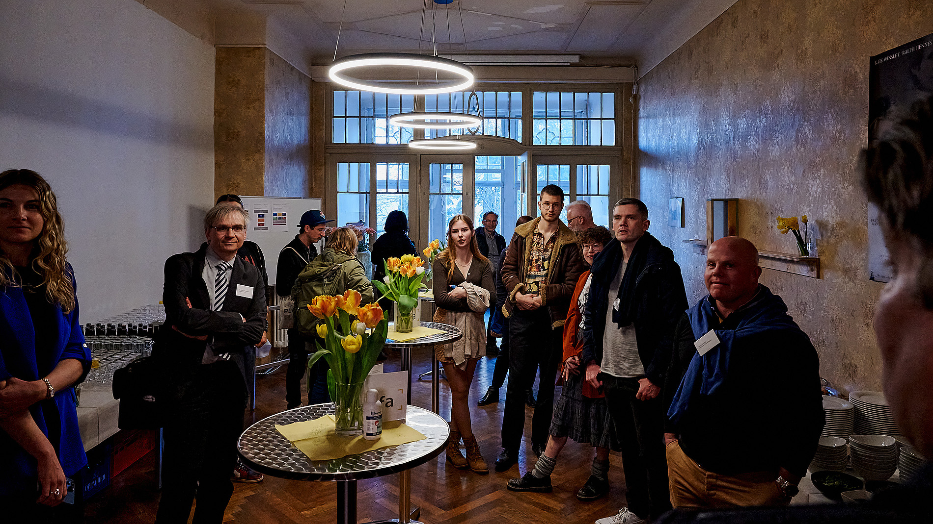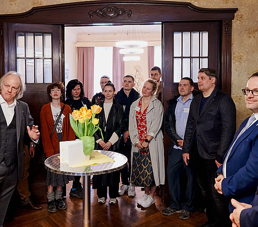 Im Anschluss an die Glückwünsche von Unterstützenden wie der Mitteldeutschen Medienförderung wurden die nahe gelegenen Seminarräumlichkeiten der Filmakademie in der Jakobstraße 5a besucht. Ein Ort, der mit den Dreharbeiten für den Kinofilm „Der Vorleser“ bereits Filmgeschichte geschrieben hat.