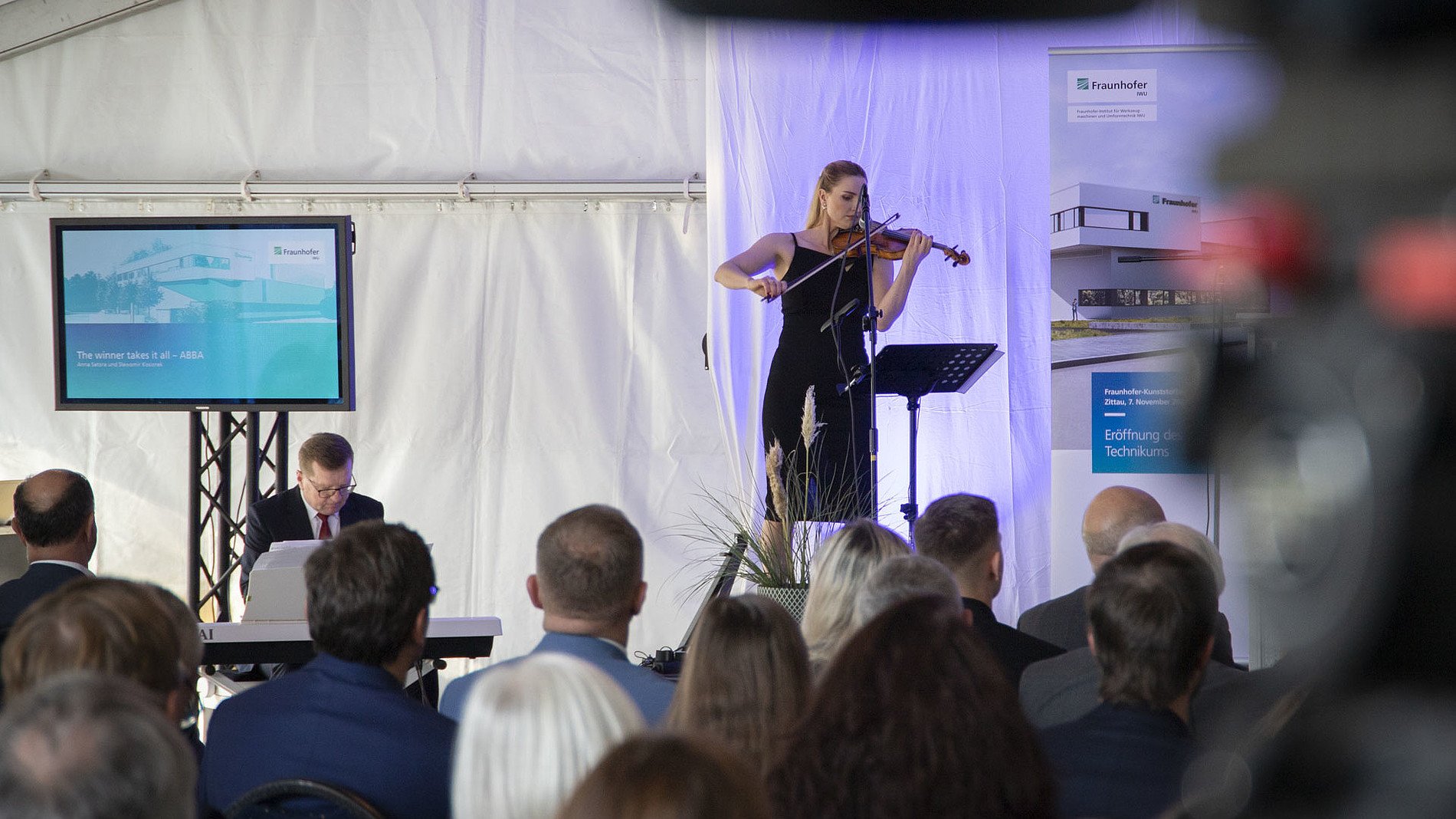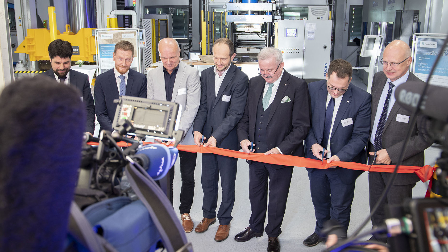 Zur feierlichen Inbetriebnahme des Erweiterungsbaus und neuen Technikums reisten Sachsens Ministerpräsident Michael Kretschmer und der Präsident der Fraunhofer-Gesellschaft Prof. Reimund Neugebauer an, um gemeinsam mit Landrat Dr. Stephan Meyer, dem Rektor der HSZG Prof. Alexander Kratzsch, dem Geschäftsführenden Institutsleiter des Fraunhofer IWU Prof. Welf-Guntram Drossel, dem Leiter des Fraunhofer-Kunststoffzentrums Oberlausitz Prof. Sebastian Scholz sowie dem Vorstandsvorsitzenden des Allgemeinen Unternehmerverbands Zittau und Umgebung Bert Handschick symbolisch das Band zur Vergrößerung des Forschungszentrums zu durchschneiden.