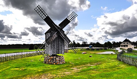 Am vierten Tag der Exkursion galt es weitere Facetten der größten Insel Estlands zu entdecken. Hierzu zählt zum Beispiel das seltenste Naturdenkmal Estlands, der Meteoritenkrater von Kaali. Hier schlug vor ca. 7500 Jahren ein Meteorit ein und hinterließ einen Krater mit einem Durchmesser von 110 Metern. Die Reiseführung erklärte der Studentengruppe, dass durch Umlaufen des Kraters Wünsche in Erfüllung gehen. Daraufhin machten sich einige Studenten auf den Weg und umrundeten den See. Außerdem besichtigte die Gruppe die höchste Steilküste der Insel und den Mühlenberg von Angla. Dieser beherbergt fünf für die Geschichte der Insel typische Holzwindmühlen und gilt als Wahrzeichen Saaremaas. Im Anschluss reiste die Gruppe weiter nach Pärnu, in die sogenannte „Sommerhauptstadt Estlands“. Mit seinen langen Sandstränden, vielen Cafés und Restaurants ist die Hafenstadt das wichtigste Ferienziel des Landes während der warmen Monate.Windmühle in Angla