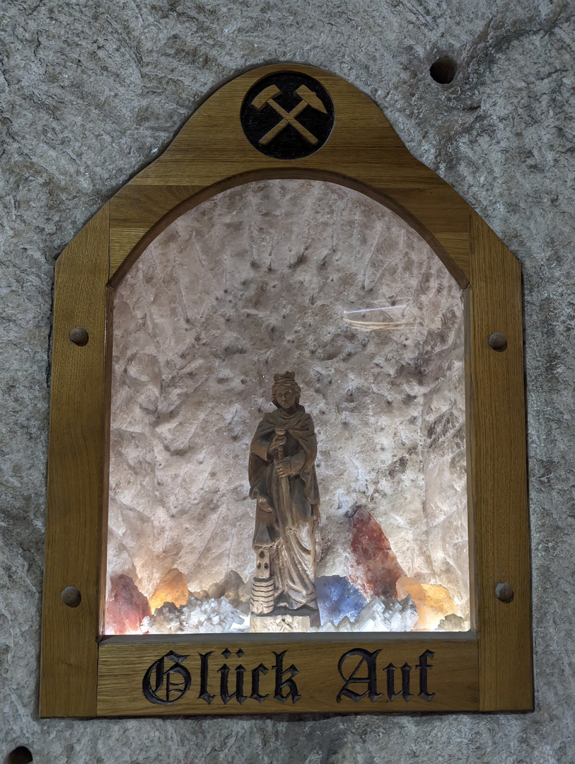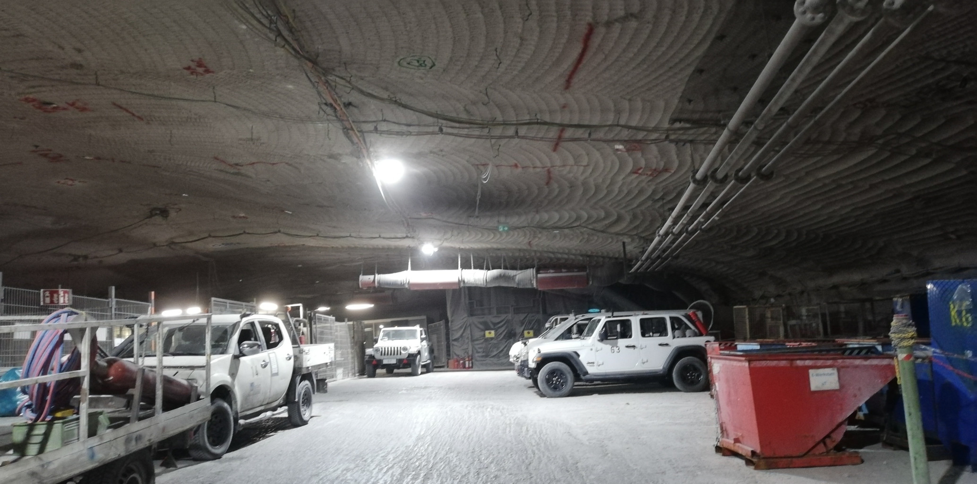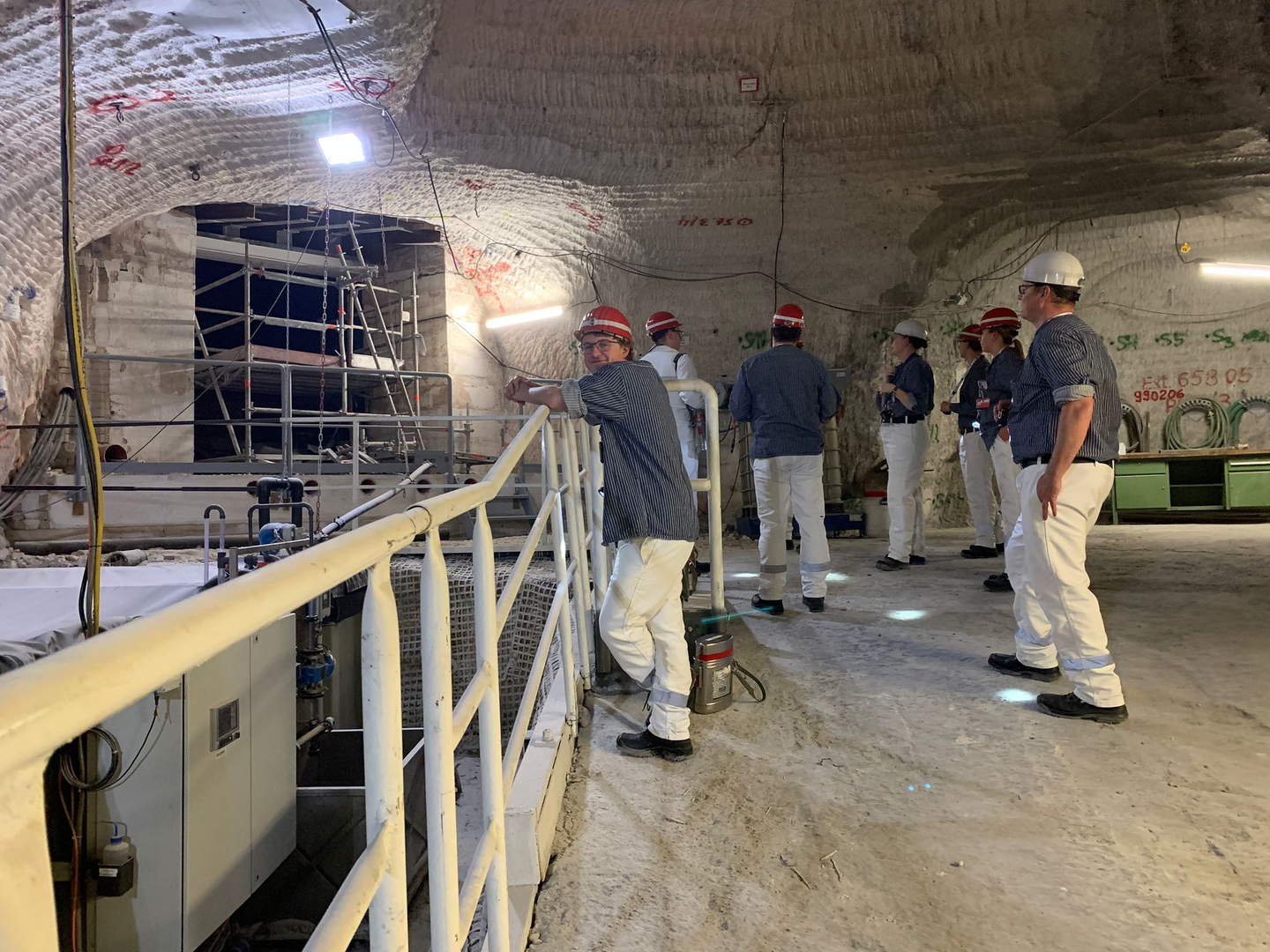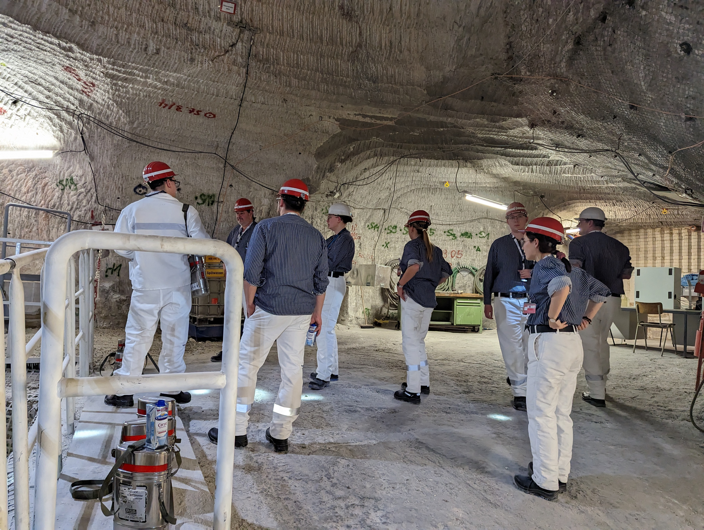 Nach einem Briefing über das Verhalten Untertage, der Sicherheitseinweisung zur Verwendung des Selbstretters und einer Stärkung zum Mittag ging es zum Umkleiden, um in das Bergwerk einfahren zu können. Mit einer Geschwindigkeit von 10 m/s ging es im Förderkorb dann auf 490 m Tiefe im Endlager hinab. Dort angekommen startete eine ca. zweistündige Befahrung der Schachtanlage. Zu sehen gab es neben der Bewetterungsanlage und der Fahrzeugwerkstatt auch Kavernen, welche einen kontinuierlichen Wassereintritt aufweisen. Aufgrund des Alters der Anlage ist es an vielen Stellen nötig, dass die Kammern und Wege mit Sorelbeton, einem speziellen Salzbeton, stabilisiert werden. Dies dient der Sicherung der Anlage, bis die 2033 planmäßig beginnende Rückholung begonnen wird. Das Ausfahren aus dem Bergwerk ist nur zur vollen Stunde möglich, sodass die Gruppe kurz nach 16:00 Uhr wieder die Oberfläche erreichte. Weitere aufgetretene Fragen wurden in einer kurzen Nachbesprechung zur Befahrung von dem verantwortlichem Mitarbeiter der BGE beantwortet. 16:45 Uhr ging es dann zurück nach Zittau.