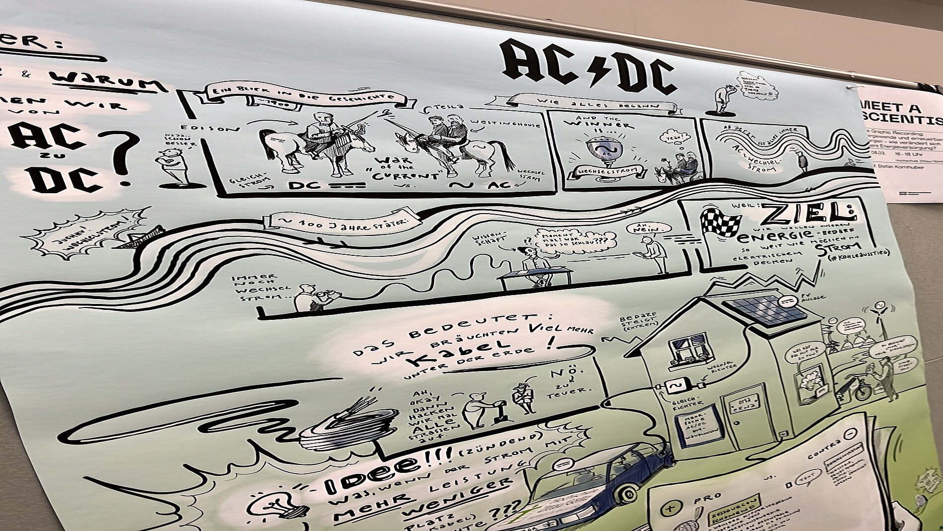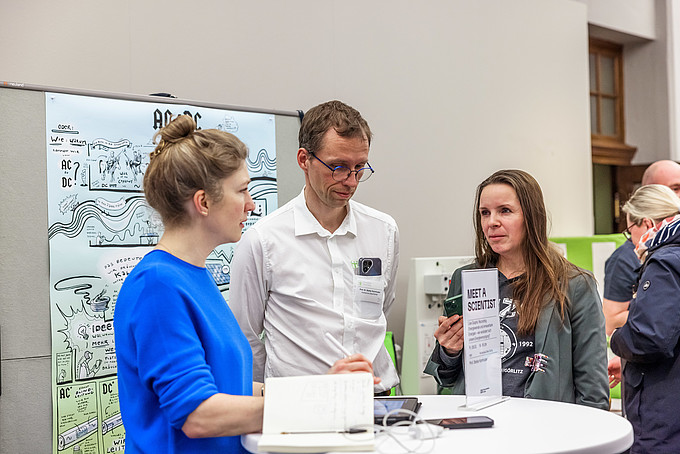 Die Herausforderung, Wissenschaft auch für Fachfremde verständlich zu machen, wurde unter anderem durch „Graphic Recording“ beim Format „Meet a Scientist“ erfolgreich gemeistert. Prof. Dr. Kornhuber erläuterte seine Forschung zur Energieversorgungstransformation, unterstützt durch anschauliche Visualisierungen.