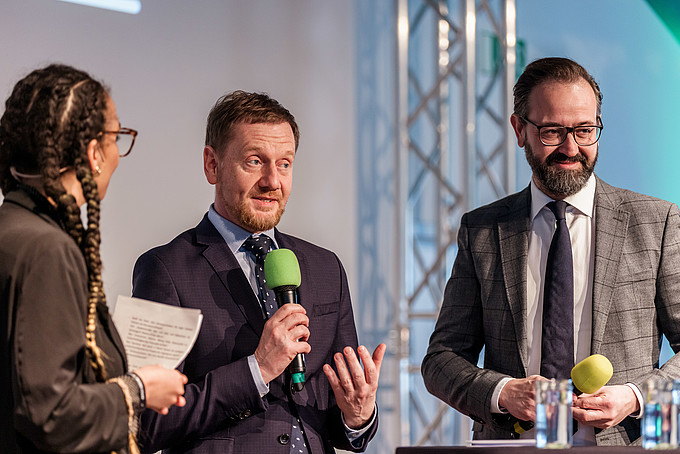 In der Eröffnungsveranstaltung mit Ministerpräsident Michael Kretschmer und Wissenschaftsminister Sebastian Gemkow begeisterte unsere Prorektorin für Bildung und Internationales, Prof.in. Dr.in. Sophia Keil mit einem Plädoyer für die Wissenschaft und Lehre in Sachsen und der Oberlausitz: "Es erfüllt mich mit großem Stolz, dass ich hier als Repräsentantin der Oberlausitz und der Wissenschaft im ländlichen Raum sitzen darf. An unseren Hochschulen widmen wir uns der Ausbildung der Entscheidungsträger*innen von morgen. Dieser Verantwortung begegnen wir an der Hochschule Zittau/Görlitz durch den Einsatz innovativer Lehr- und Lernmethoden sowie mit außerordentlicher Hingabe. Unser Ansatz integriert die Erkenntnisse aus unserer praxisnahen Forschung unmittelbar in die Lehre. Dadurch gewährleisten wir, dass unsere Studierenden auf dem neuesten Stand der Wissenschaft ausgebildet werden und bestens für die Herausforderungen der Zukunft gerüstet sind."