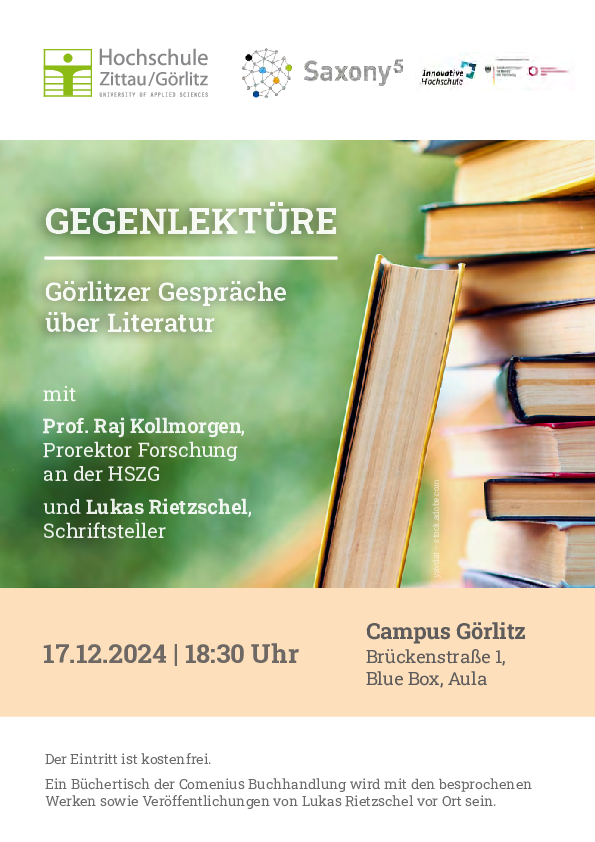 Über Geschmack und Literatur ließ sich schon immer gut streiten, oder? Kurz vor dem Jahresende brechen die beiden Görlitzer Literaturliebhaber Professor Raj Kollmorgen und Lukas Rietzschel eine Lanze für das Lesen guter Bücher. 2 Werke bringen die Diskutanten jeweils mit und laden zum Austausch ein. Dabei kommen auch die Leser und Leserinnen im Publik zu Wort. Es erwartet Sie eine etwas andere Unterredung, ein Versuch der Verständigung, in einer für viele Menschen oft quirlig-anstrengenden Vorweihnachtszeit.