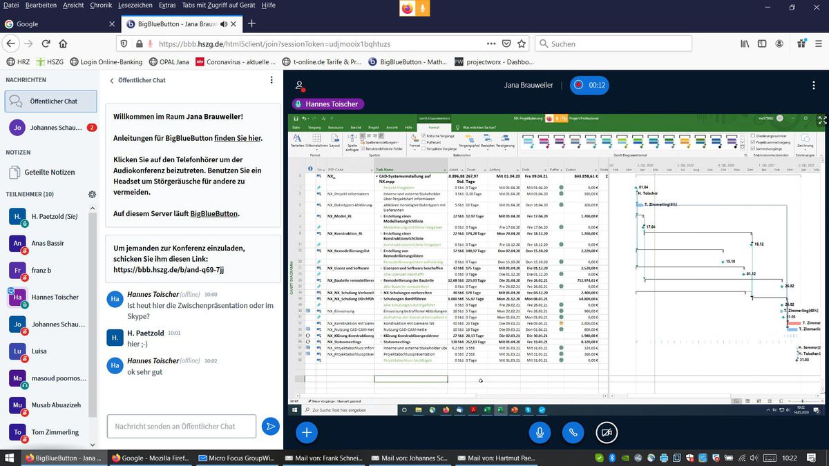 Das Ganze klappt übrigens genauso gut auch am Beispiel fiktiver Projekte, wie die Studierenden der Fakultät Maschinenwesen beweisen, die auch in diesem Semester ausschließlich online und ganz emsig komplexe Projektaufgaben bearbeiten. Unterstützt werden wir durch Hartmut Paetzold, der erstmalig die Software MSProject virtuell vermittelt und weiteren fleißigen Kolleg*Innen wie Ulrike Bobek und Johannes Schaumlöffel, die den deutlich steigenden Konsultationsbedarf abpuffern. Die Credits gehen, und das nicht nur in Form von ECTS, an unsere Studierenden.