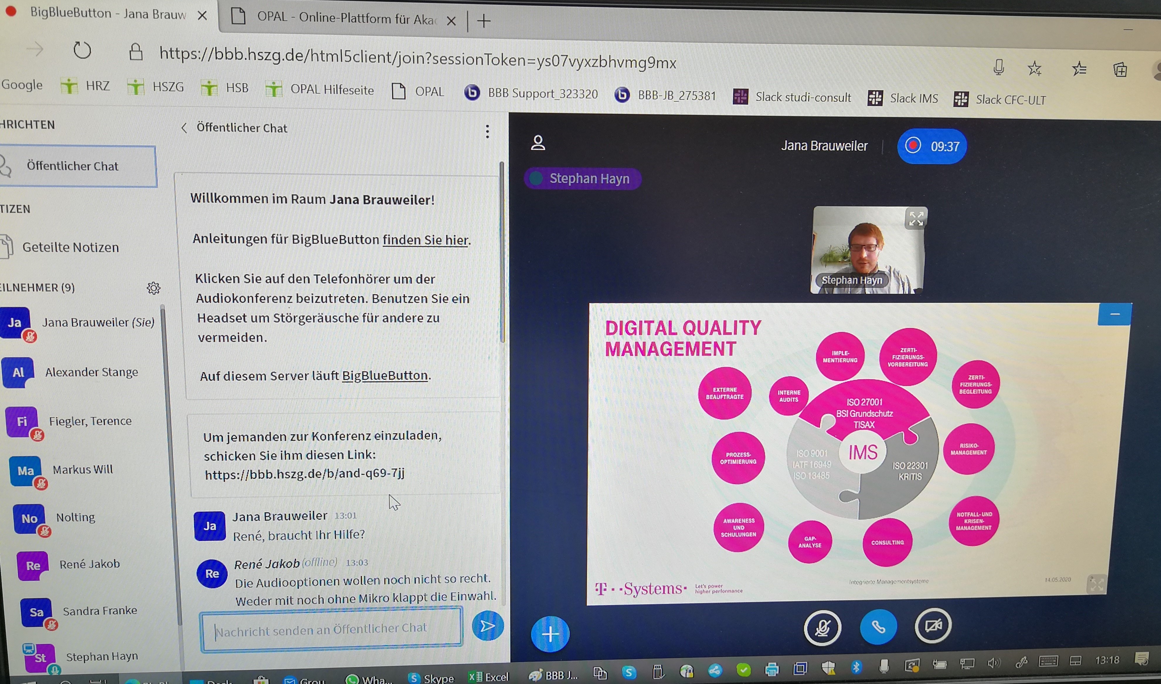 Das Unglaubliche dabei: Alle Module der Studiengänge „Integrierte Managementsysteme“/“Integriertes Management“ laufen seit Mitte März gemäß Stundenplan online. Je nach Dozent variieren die Tools: Skype, BigBlueButton, Jitsi, youtube-Kanal, Zoom, Opal, die Mischung macht es hier. Hätte uns jemand vorher gefragt, ob es möglich ist, ein komplettes Semester virtuell zu gestalten, hätten wir lachend abgewunken. Und nun werden wir das Semester planmäßig abschließen... Auch über die Lehre hinausgehende Veranstaltungen, wie unsere IMS-Seminare finden nach kurzer Pause online über BigBlueButton statt, so wie das letzte Seminar zu „TISAX – ISO 27001 in der Automobilindustrie“ mit unserem Kooperationspartner, der T-Systems Multimedia Solutions GmbH. Das Resümee der teilnehmenden Unternehmen: durchweg positiv.
