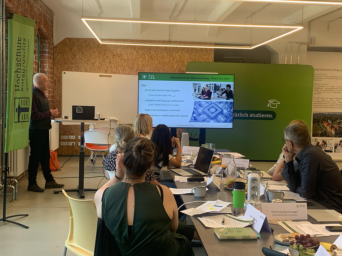 Im Mittelpunkt des Treffens stand die Frage, wie zukunftsorientierte Studienangebote an der HSZG aussehen müssen, um dem wachsenden Fachkräftebedarf der Halbleiterbranche gerecht zu werden. Gemeinsam mit Infineon diskutierten Vertreter:innen der Hochschule über die inhaltliche und strukturelle Ausgestaltung der geplanten Studiengänge Halbleiterprozesse und Materialchemie (B.Sc.) sowie Mechatronics for Manufacturing (B.Sc.), letzterer Studiengang wird in Kooperation mit der TU Liberec gestaltet. Ziel ist es, praxisnahe Curricula zu schaffen, die jungen Talenten fundierte Kompetenzen vermitteln und ihnen zugleich frühzeitige Praxiserfahrungen ermöglichen.