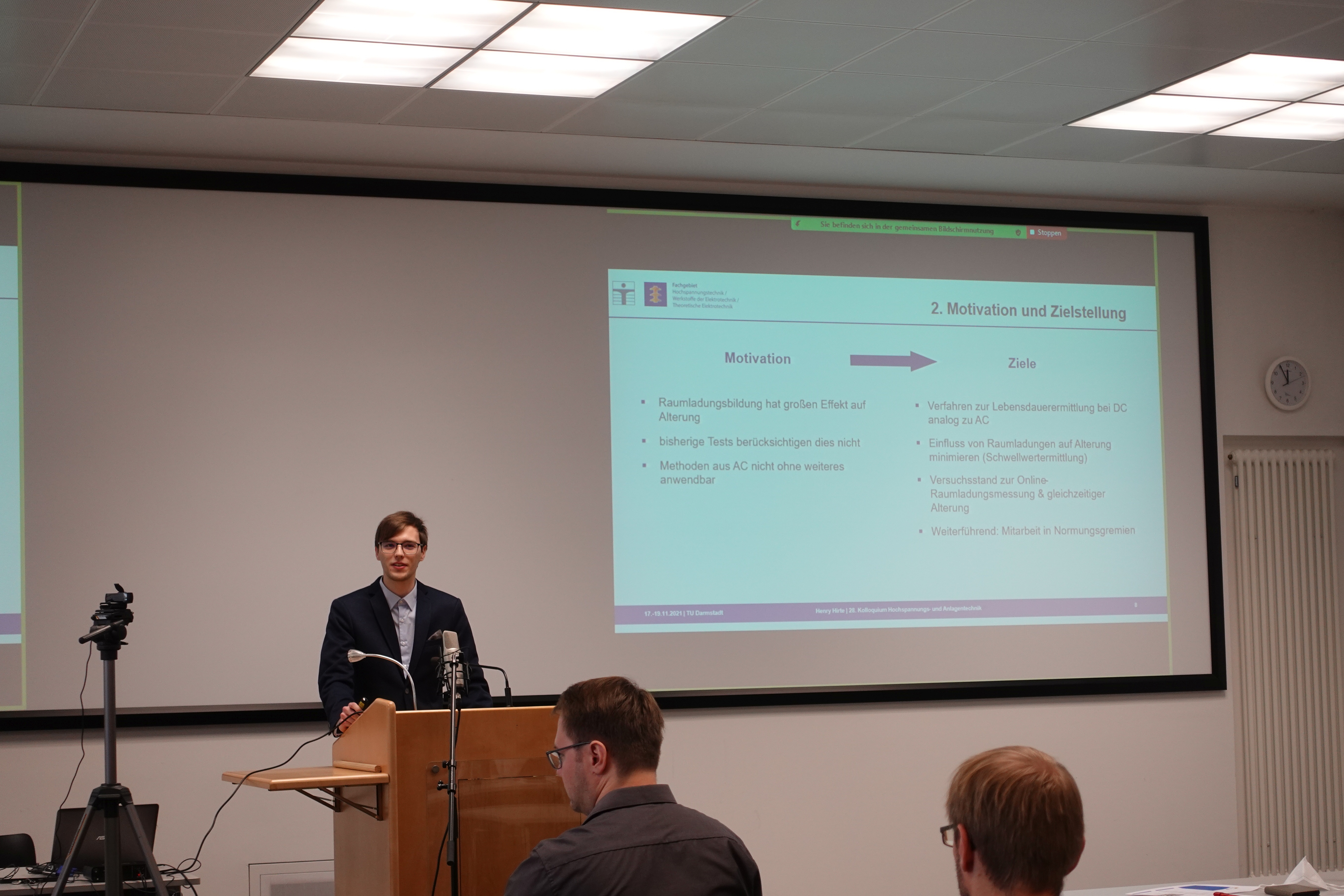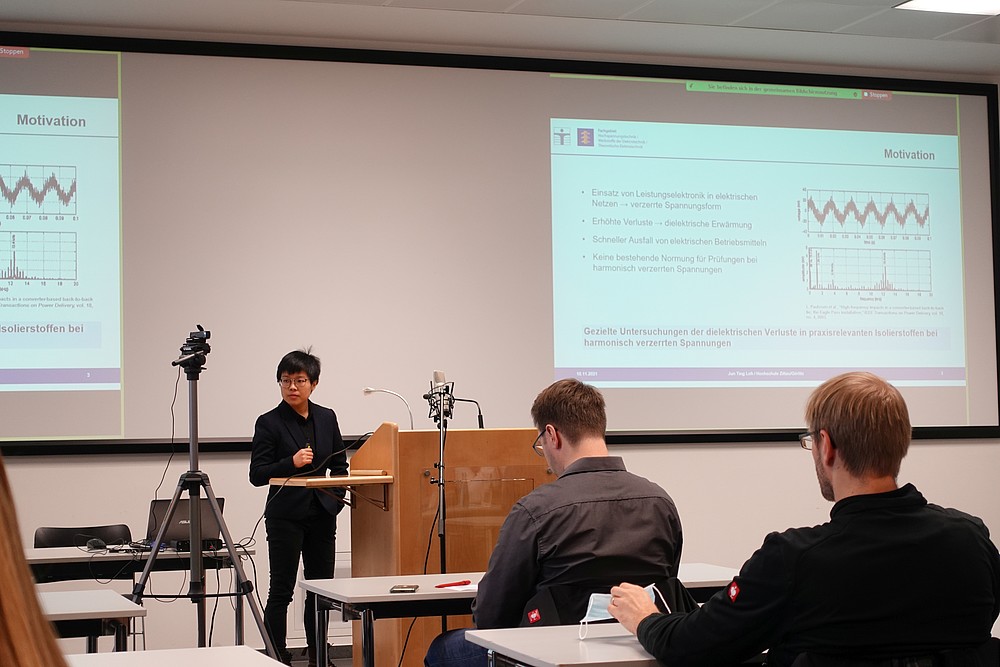 Im Anschluss präsentierten die Doktorandinnen und Doktoranden in fünf Vortragssitzungen ihre Projekte. Hierbei waren aus den Gebieten der DC-Anwendungen, Isolierstoffen, Schaltgeräten, Elektrischen Energieanlagen und Entladungsentwicklungen interessante Vorträge zu hören, aber auch einige Poster zur Diskussion gestellt. Von der HSZG waren dabei Jun Ting Loh und Henry Hirte jeweils mit einem Vortrag zum Stand ihrer Forschung vertreten.