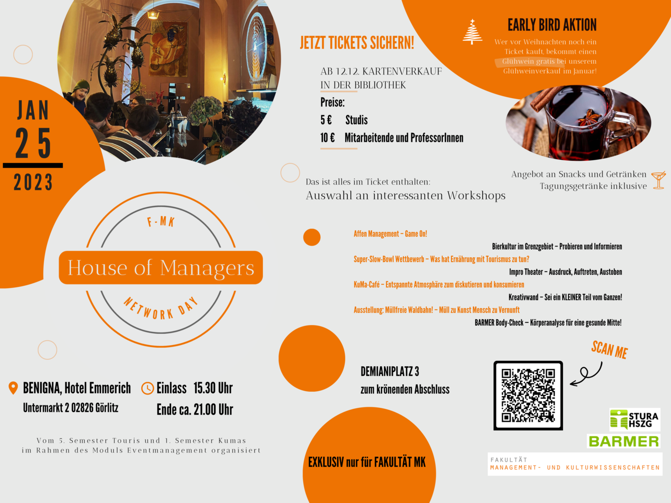 Da Studierende bekanntlich immer knapp bei Kasse sind, sind beim „House of Managers 2023“ Snacks und Tagungsgetränke, ebenfalls im Ticketpreis enthalten. Natürlich gilt das auch für die Tickets der Mitarbeitenden und Lehrenden.