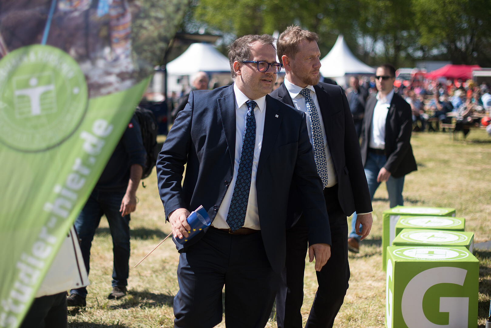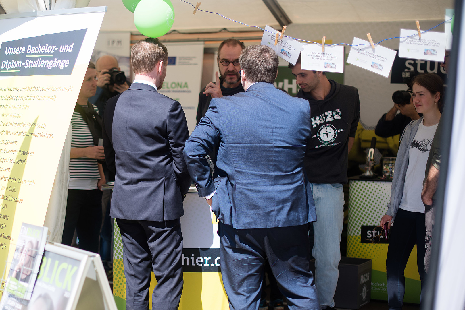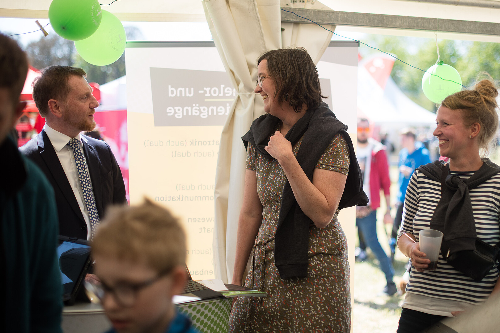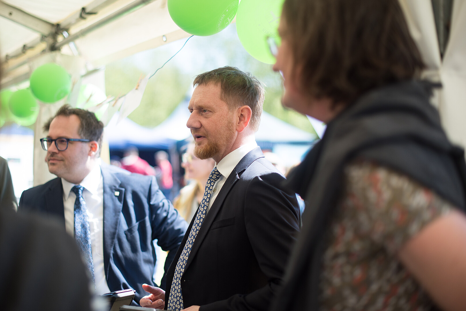 Das aus dem Förderprogramm „Wandel durch Innovation in der Region“ geförderte Projekt Life and Technology nutzte die Gelegenheit auf ein breites und vielschichtiges Publikum zu treffen und führte eine Befragung durch. Auskunftswilligen Teilnehmenden winkte als Belohnung eine quadratische Tafel Schokolade – gut, dass es nur angenehme 20° C hatte. Hier nutzte auch der sächsische Ministerpräsident Michael Kretschmer die Möglichkeit für einen Plausch mit Rektor Prof. Alexander Kratzsch und Prorektor für Forschung Prof. Raj Kollmorgen und informierte sich zum neu gestarteten Deutsch-Polnischen INTERREG-Projekt "Grüne Zukunft des Grenzraumes".