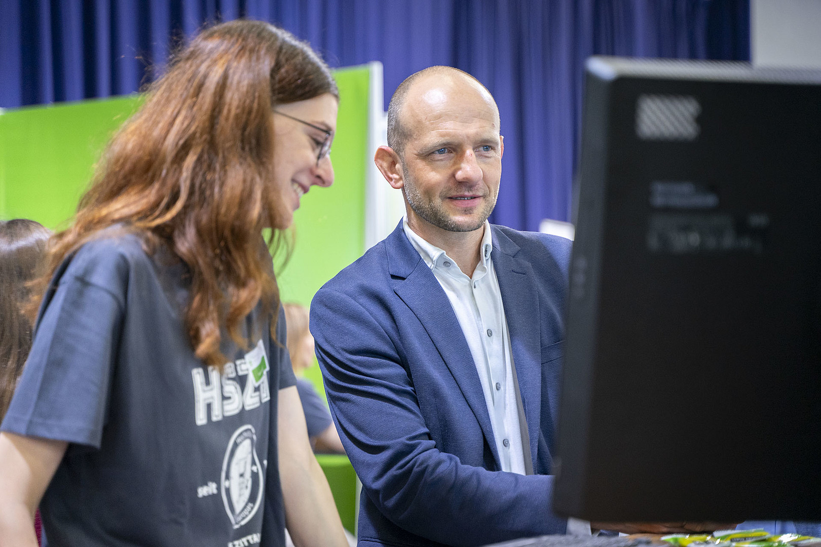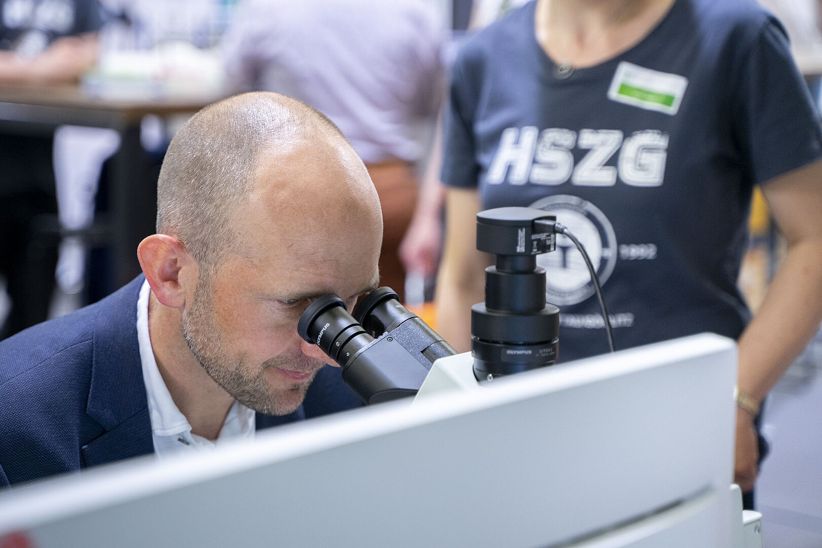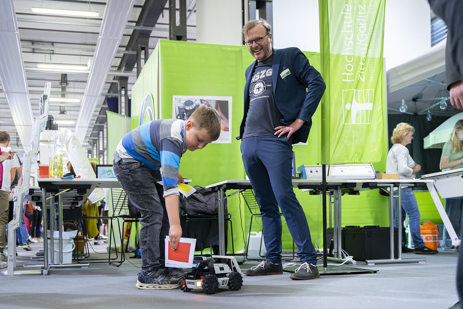 Gemeinsam mit Landrat Dr. Stephan Meyer besuchte der Rektor der HSZG, Prof. Dr.-Ing. Alexander Kratzsch, die „HSZG-Erlebniswelt“ in der Blumenhalle des Messegeländes. Landrat Meyer betonte bei seinem Besuch, dass er es toll findet, dass am HSZG-Stand verschiedene Studiengänge thematisch zusammengefasst und präsentiert wurden. Seiner Meinung nach richte sich die Entscheidung von Studieninteressierten an Themen und weniger an einzelnen Studiengängen aus.
