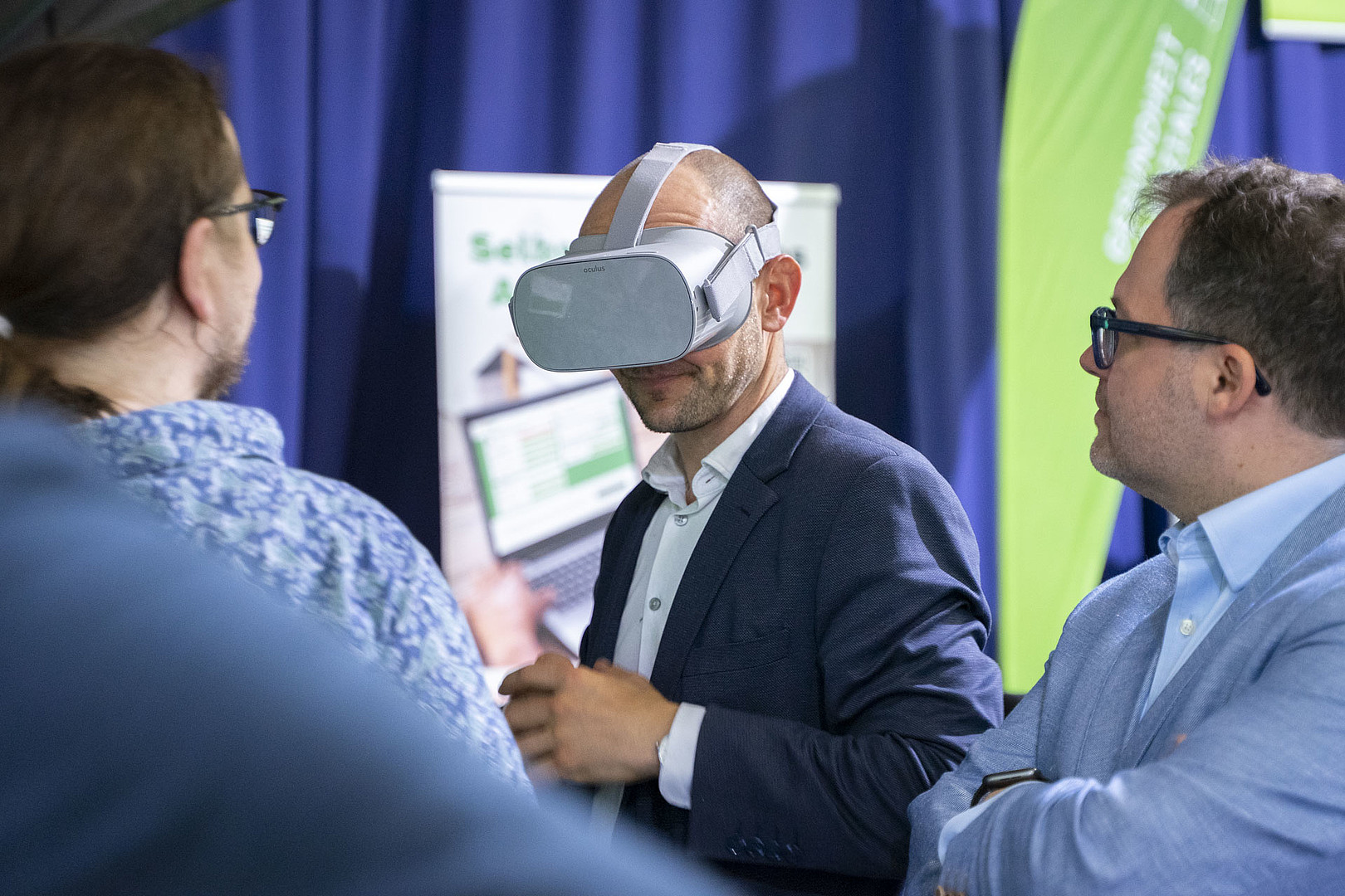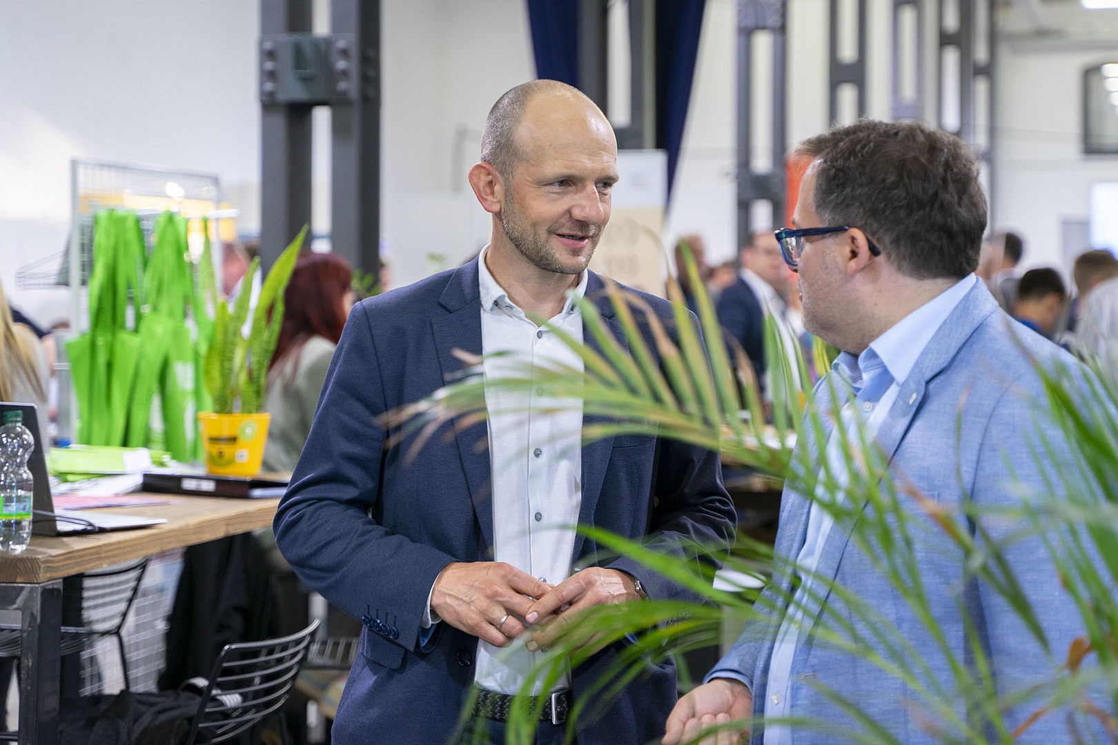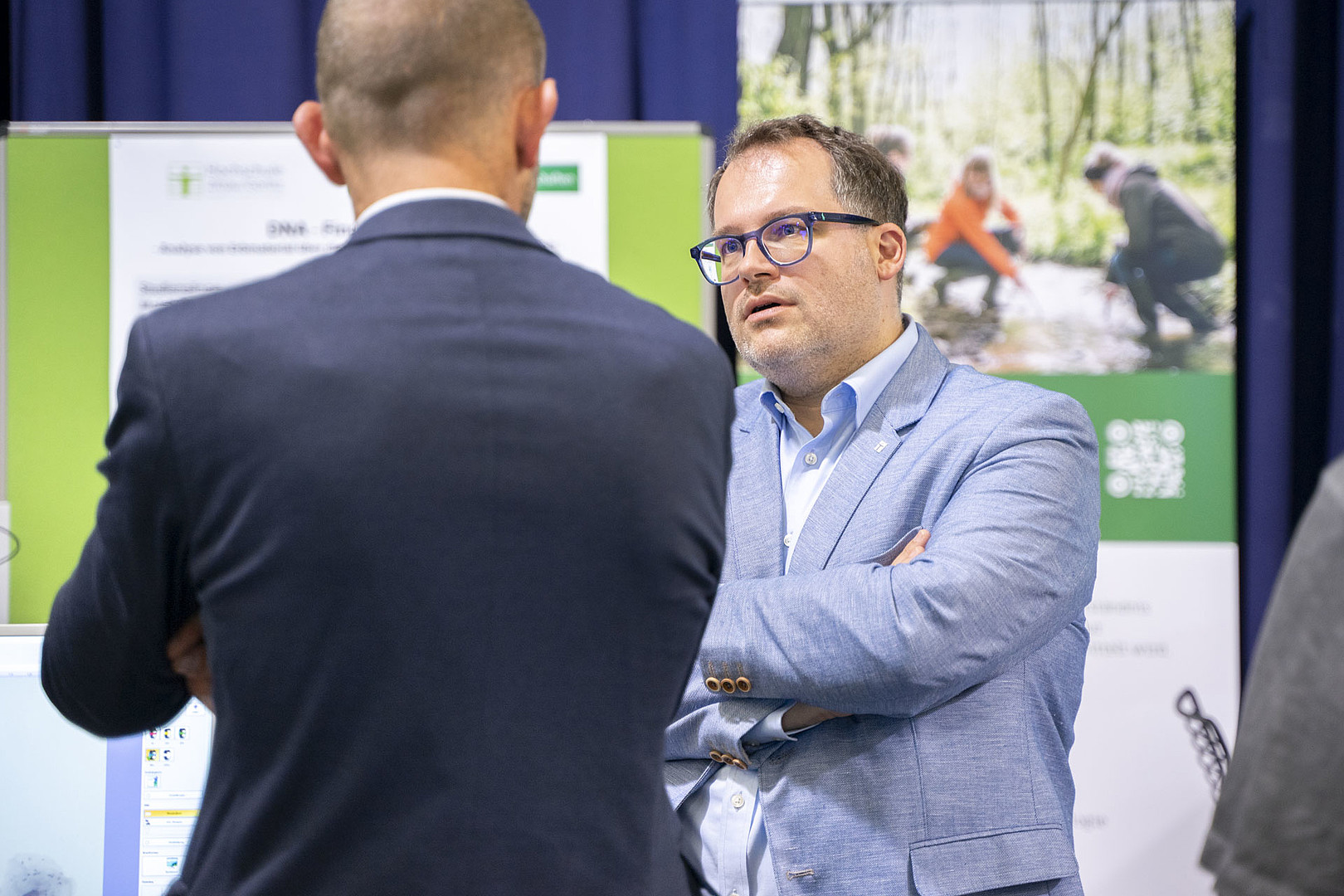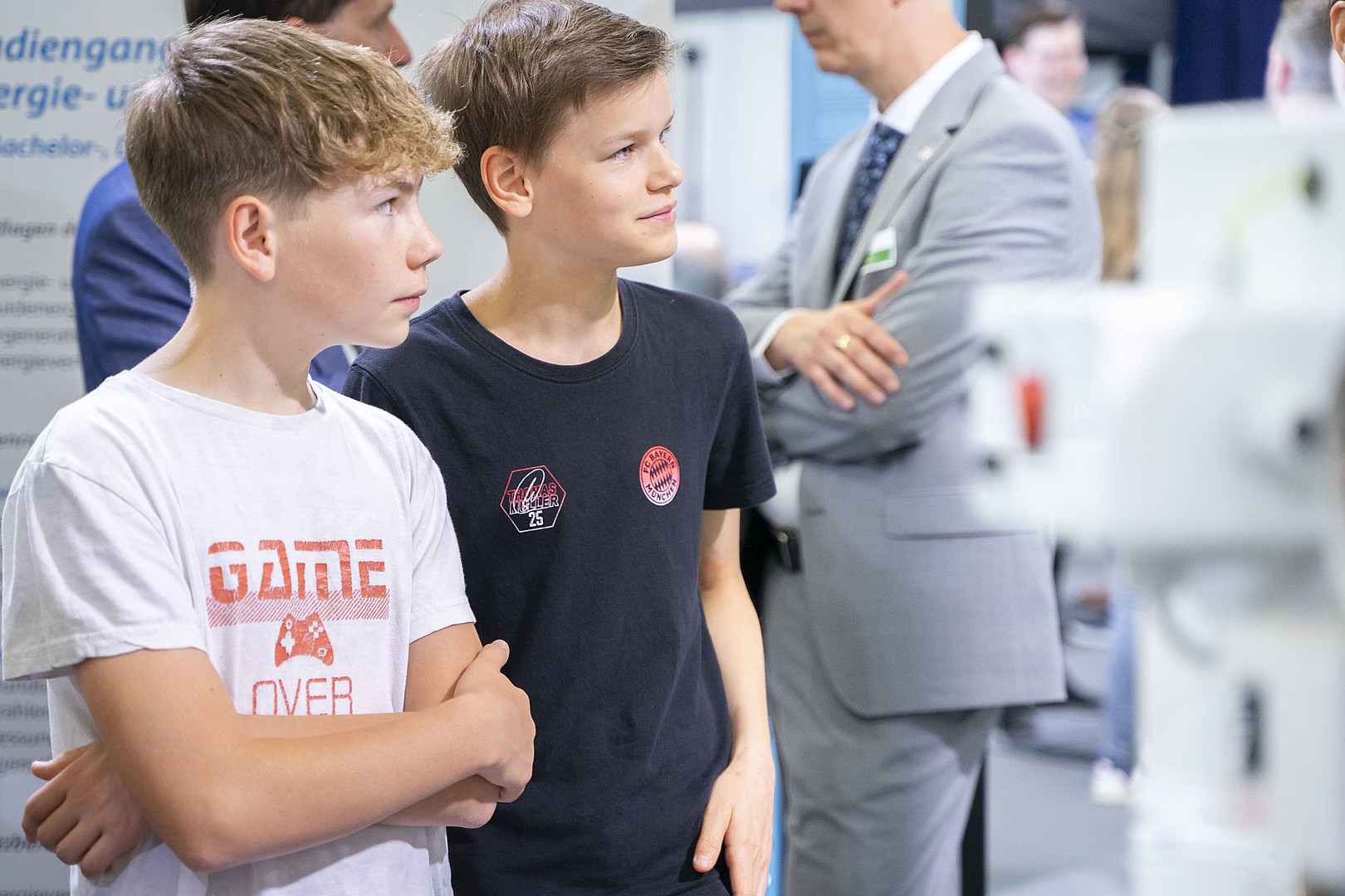 Gemeinsam mit Landrat Dr. Stephan Meyer besuchte der Rektor der HSZG, Prof. Dr.-Ing. Alexander Kratzsch, die „HSZG-Erlebniswelt“ in der Blumenhalle des Messegeländes. Landrat Meyer betonte bei seinem Besuch, dass er es toll findet, dass am HSZG-Stand verschiedene Studiengänge thematisch zusammengefasst und präsentiert wurden. Seiner Meinung nach richte sich die Entscheidung von Studieninteressierten an Themen und weniger an einzelnen Studiengängen aus.
