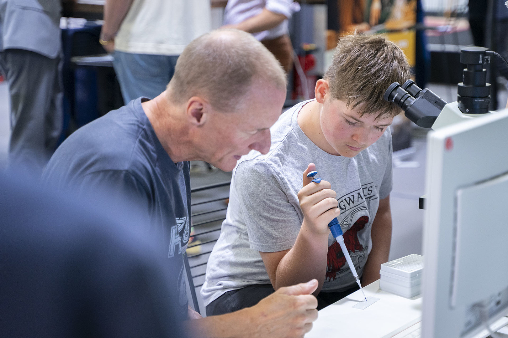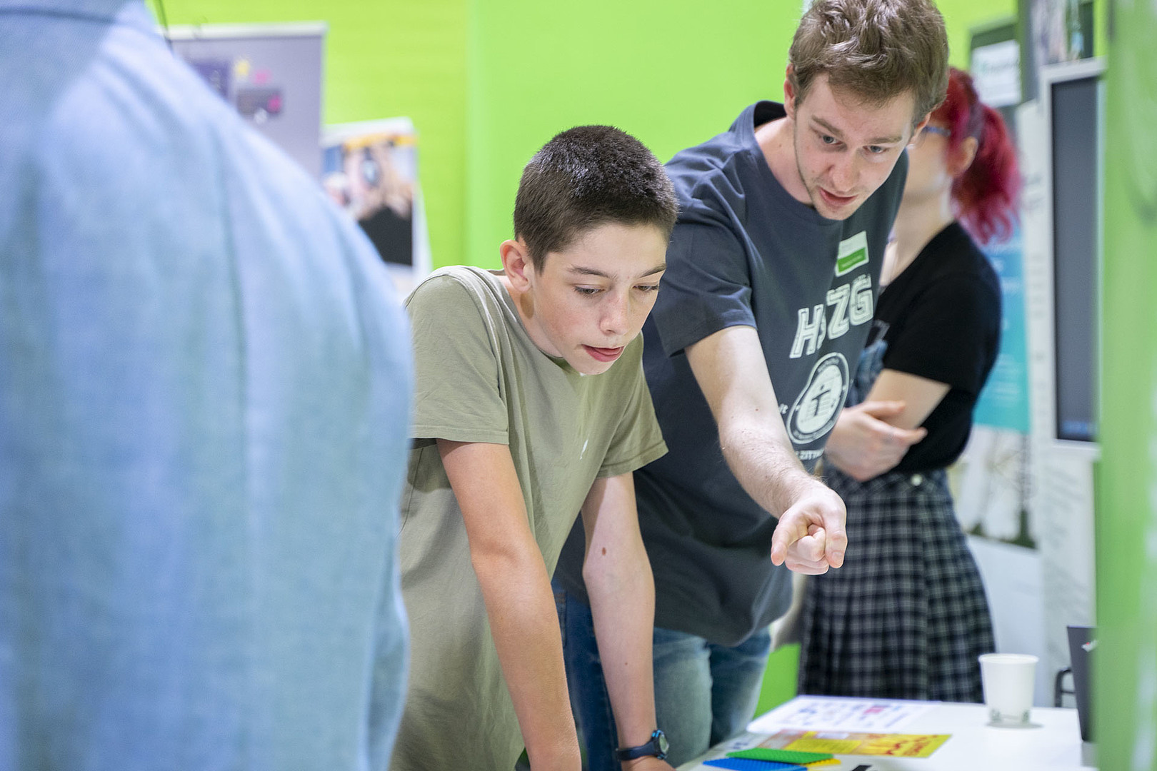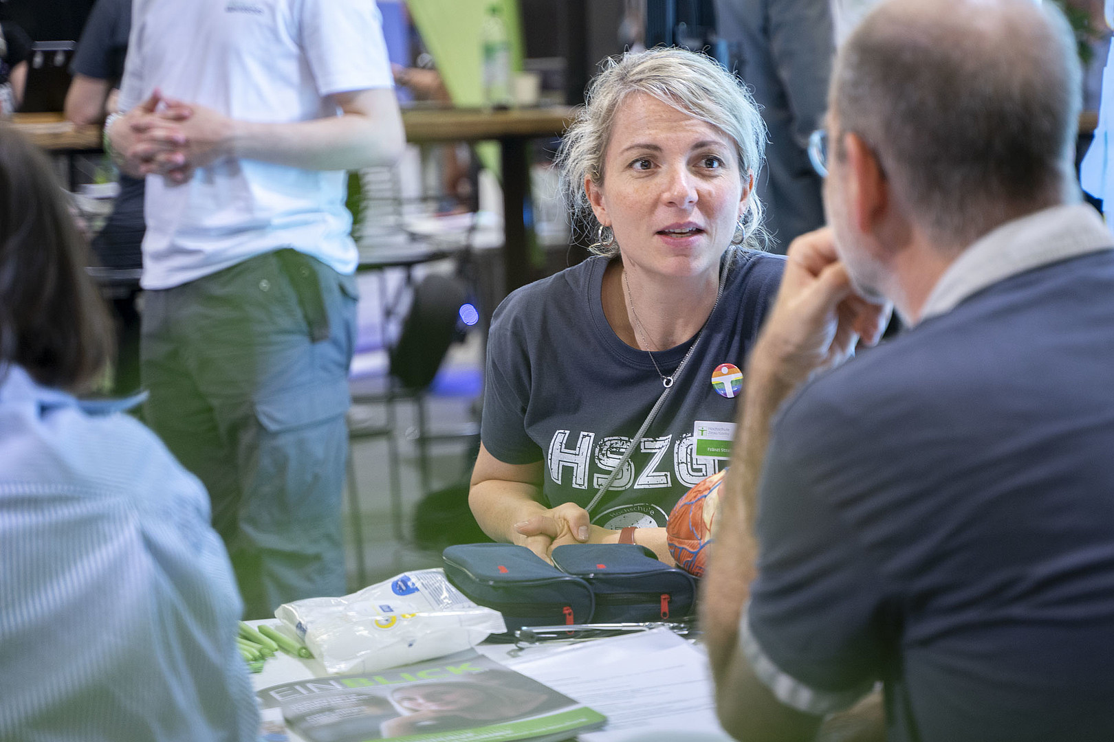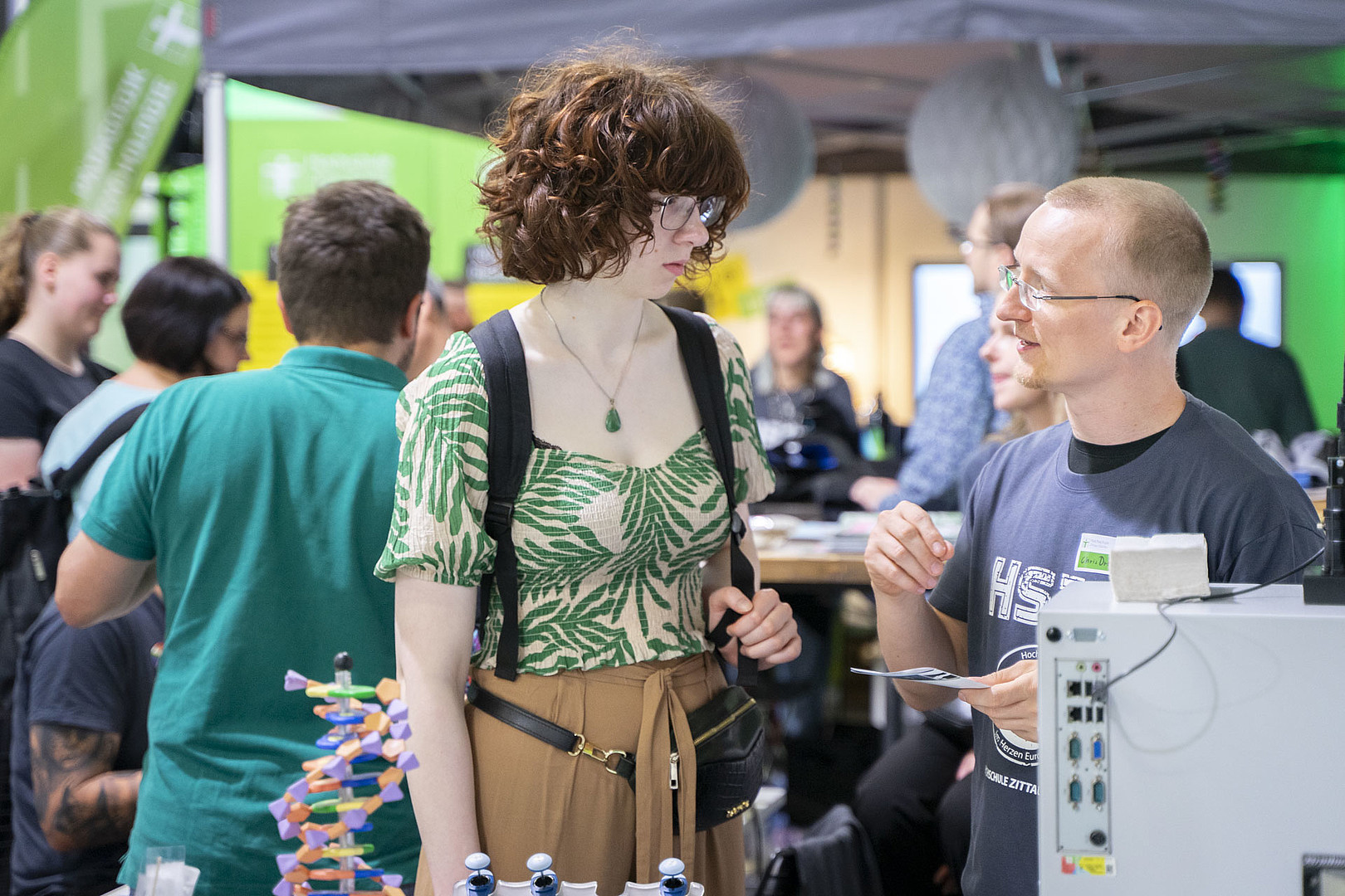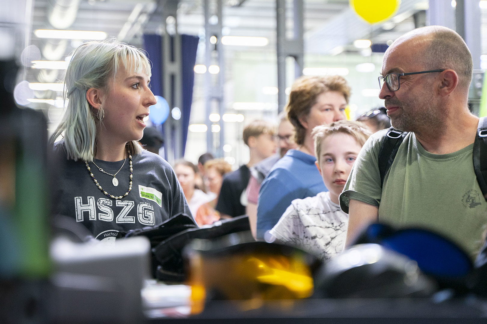 Am groß angelegten Stand der HSZG hatten die Besucher*innen die Möglichkeit, sich ausführlich über die verschiedenen Studiengänge und Angebote zu informieren, aber vor allem auch selbst ‘Hand anzulegen‘, um Forschung direkt zu erleben. So tauchten sie mithilfe einer VR-Brille in die virtuelle Realität ein und erfuhren, was damit alles möglich ist. Kriminologisch ging es zu beim Stand der Biotechnologie: Hier wurde anhand eines Abstrichs der Mundschleimhaut untersucht, wie DNA-Spuren an Tatorten analysiert werden. Beim KI-Demonstrator konnten die Besuchenden die KI auf die Probe stellen und sehen, wie diese Objekte identifiziert und welche Technologie dem Ganzen zugrunde liegt. Lag das Interesse mehr im sozialwissenschaftlichen Bereich, erfuhren Interessierte, wie sich Maßnahmen für Inklusion und Barrierefreiheit in die Praxis umsetzen lassen. Die „Hello Mirrors“-Gesundheitsspiegel luden dazu ein, mehr zum Thema aktivierende Pflege zu erfahren.