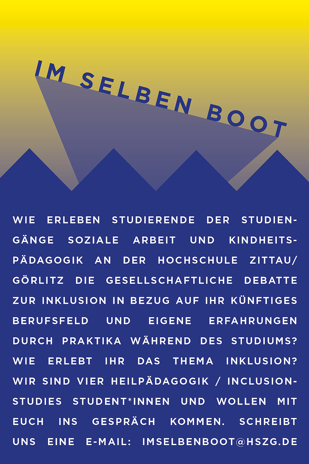 Projektteam "Im selben Boot?"[/caption]So beschlossen wir, zunächst an der eigenen Hochschule zu beginnen, denn auch Kindheitspädagogen und Sozialarbeiter werden (höchstwahrscheinlich) in Zukunft mit der Inklusionthematik konfrontiert sein und sich Arbeitsfelder mit uns Heilpädagogen teilen.Mit der Fragestellung “Wie erleben Studierende der Studiengänge Soziale Arbeit und Kindheitspädagogik an der Hochschule Zittau/Görlitz die gesellschaftliche Debatte zur Inklusion in Bezug auf ihr künftiges Berufsfeld und eigene Erfahrungen während des Studiums?” umwarben wir persönlich, mit Aushängen, Flyern und E-Mails für unser Projekt und waren sehr glücklich, dass das neue Rezept anscheinend aufging und die Idee hier vor Ort auf Interesse stieß.