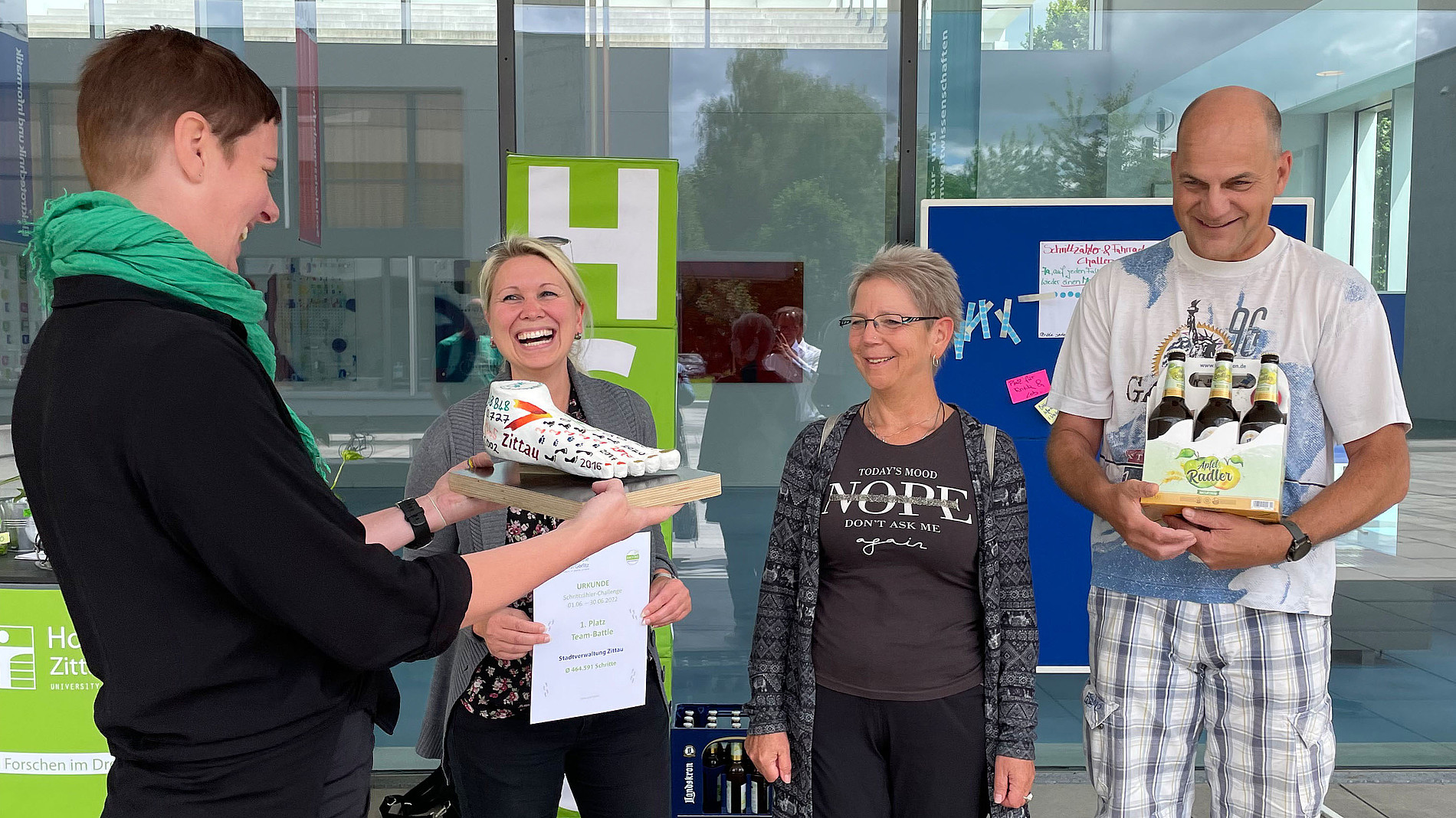 Mit einer App, welche die BARMER freundlicherweise zur Verfügung stellte, wurden die Schritte der einzelnen Teilnehmer*innen gezählt und es gab das übliche Team-Battle; Stadtverwaltung Zittau vs. Stadtverwaltung Görlitz vs. Hochschule Zittau/Görlitz. Die Stadtverwaltung Zittau konnte das Battle für sich entscheiden und ergatterte erneut den beliebten Fuß, der seit 2016 als Wanderpokal weitergereicht wird.