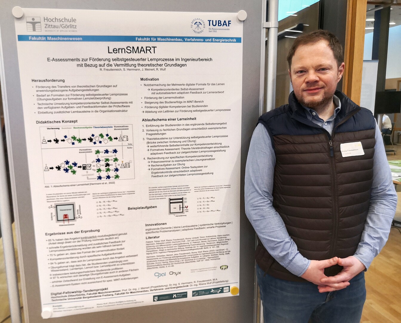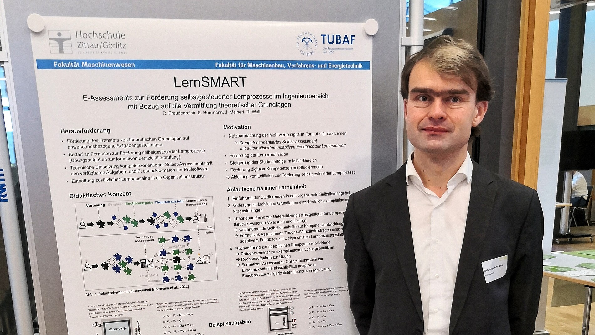 Ronny Freudenreich, M.A. (Zentrum für Wissenstransfer und Bildung) und Dr.-Ing. Sebastian Herrmann (Fakultät Maschinenwesen) von der Hochschule Zittau/Görlitz präsentierten das LernSMART-Konzept, einen E-Assessment-Ansatz zur Förderung selbstgesteuerter Lernprozesse im Ingenieurbereich mit Bezug auf die Vermittlung theoretischer Grundlagen im MINT-Bereich mit einem Poster. Das Digital-Fellowship-Projekt LernSMART (gefördert vom Sächsischen Staatsministerium für Kunst und Tourismus im Rahmen der Förderung des Verbundprojekts Digitale Hochschulbildung in Sachsen) der Hochschule Zittau/Görlitz (Fakultät Maschinenwesen, Prof. Dr.-Ing. Jens Meinert) und der Technischen Universität Bergakademie Freiberg (Fakultät für Maschinenbau, Verfahrens- und Energietechnik, Frau Dr.-Ing. Rhena Wulf) begegnet der Herausforderung, das vermittelte theoretische Wissen auf spezifische Anwendungsfälle zu übertragen, mit der Entwicklung ergänzender E-Learning-Angebote zum Erkennen des richtigen Lösungsansatzes. Ziel ist es, die bestehenden Formate (z. B. komplexere Selbst-Assessment-Aufgaben) zur Förderung selbstgesteuerter Lernprozesse besser nutzbar zu machen, den Transfer hin zur eigenen kognitiven Leistung zu fördern und das Lernen sowie den Austausch in der gesamten Seminargruppe aufgrund eines einheitlichen Verständnisses zu begünstigen.
