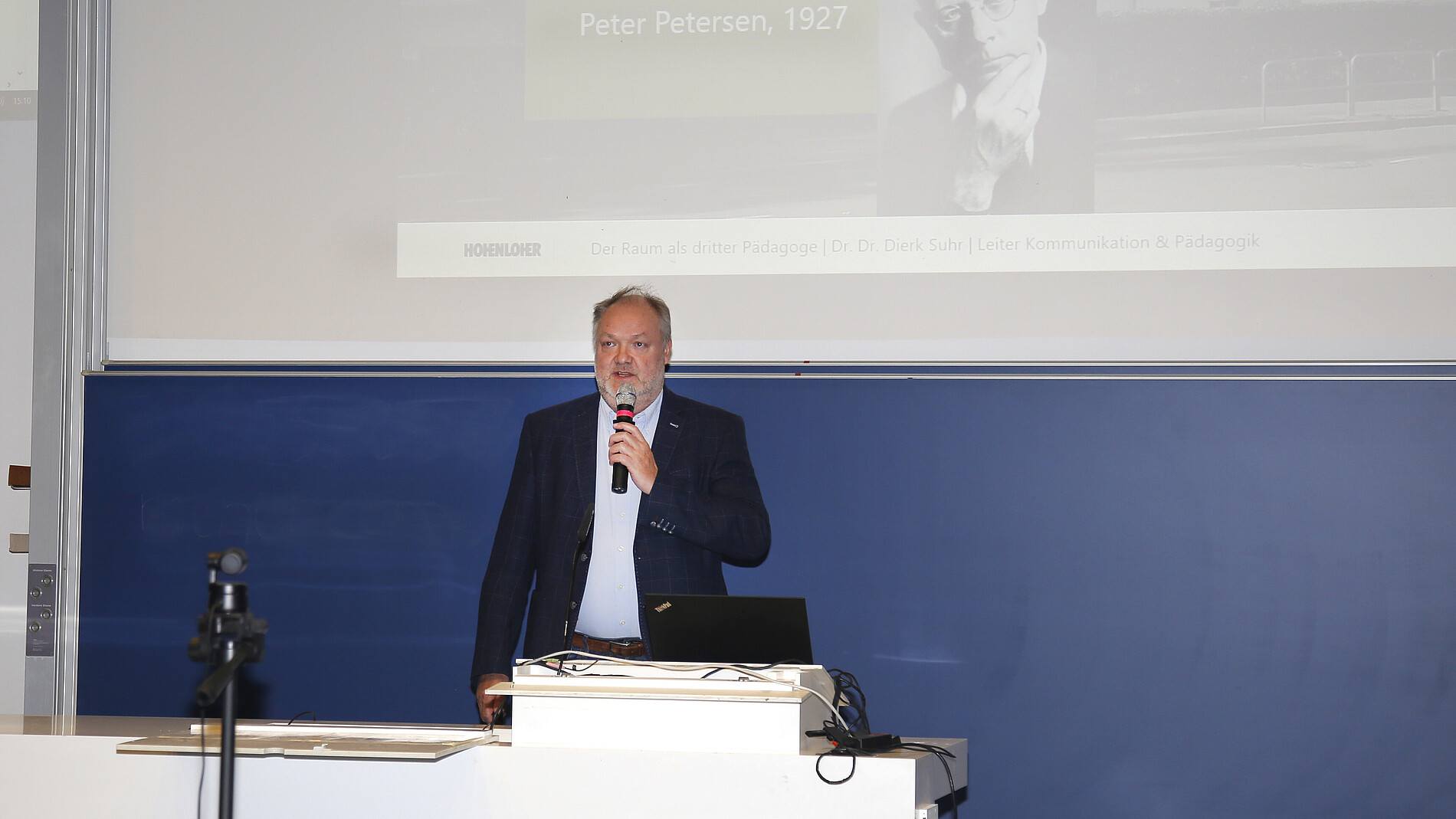Dr. Dr. Dierk Suhr, Leiter Kommunikation & Pädagogik beim Hohenloher Spezialmöbelwerk, hielt einen Vortrag mit dem Titel "Der Raum als dritter Pädagoge – Neue Didaktik braucht auch neue Raumkonzepte". Dabei gab er wertvolle Einblicke in das Lernen von Morgen, das maßgeblich von Kollaboration, Kommunikation, kritischem Denken und Kreativität geprägt ist. Diese Elemente werden wesentlich von der Lernumgebung beeinflusst. Es ist daher für jede Bildungseinrichtung wichtig, dies bei ihren Planungen zu berücksichtigen und neue Wege zur Wissensvermittlung zu gehen.